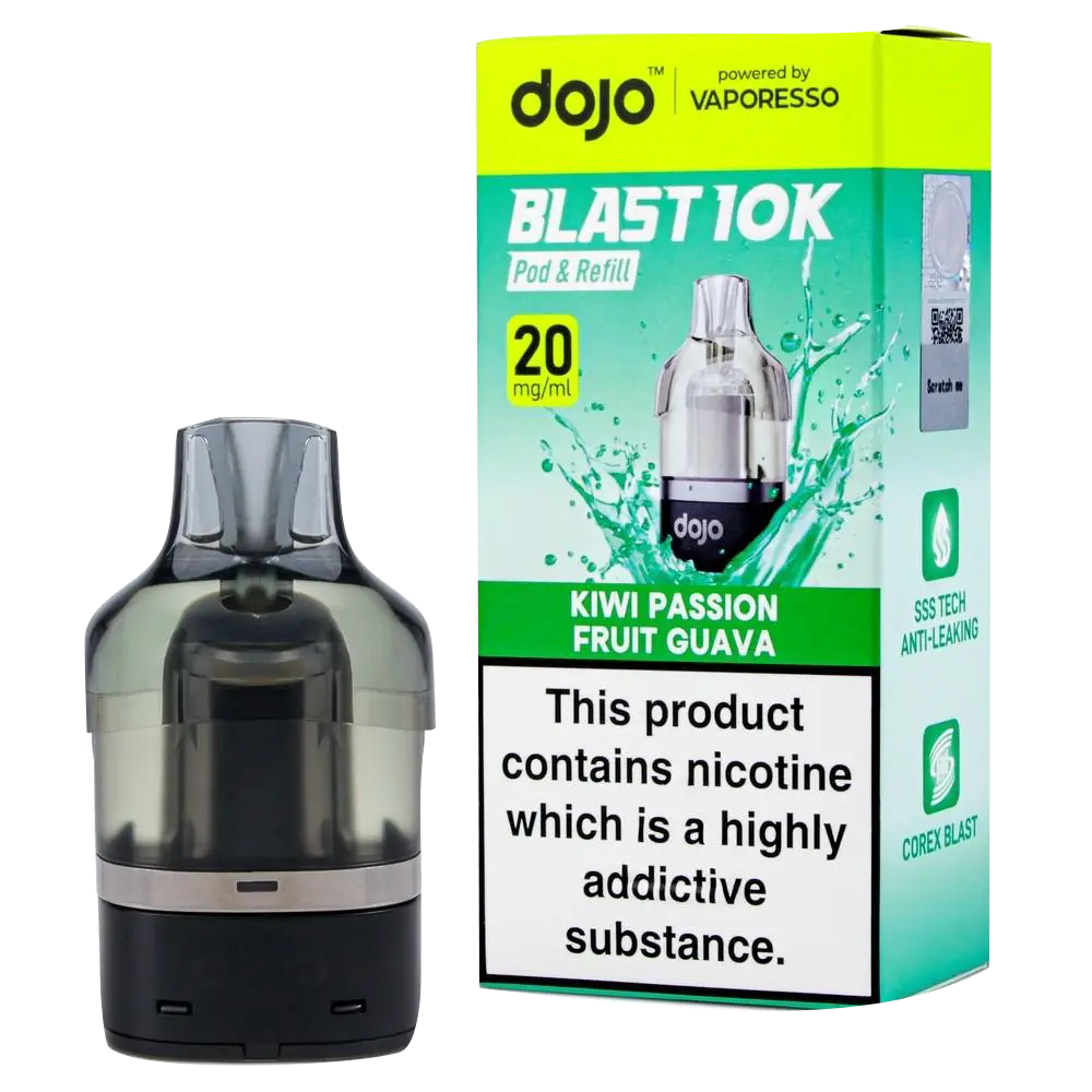 The Kiwi Passion Fruit Guava Dojo Blast 10K pods blend tropical fruits for an exotic MTL vape. Compatible with the Dojo Blast 10K Kit and Dojo Blast 30K Kit, these prefilled pods include a 2ml TPD-compliant pod and 8ml auto-refill container providing up to 10,000 puffs. The Corex 2.0 mesh coil balances all three fruit flavours whilst the leak-resistant design prevents spills. Each pack contains 20mg nic salt e-liquid for smooth nicotine delivery.