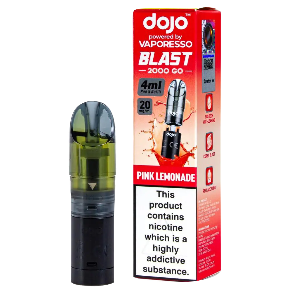 The Dojo Blast 2000 Go Pink Lemonade pods blend tart lemon with sweet berry notes for a balanced citrus-fruit experience. Designed for the Dojo Blast 2000 Go Kit and Dojo Blast 2000 Go V2 Kit, these prefilled pods provide 4ml of 20mg salt nicotine e-liquid through a dual-pod system that extends usage compared to standard 2ml pods.