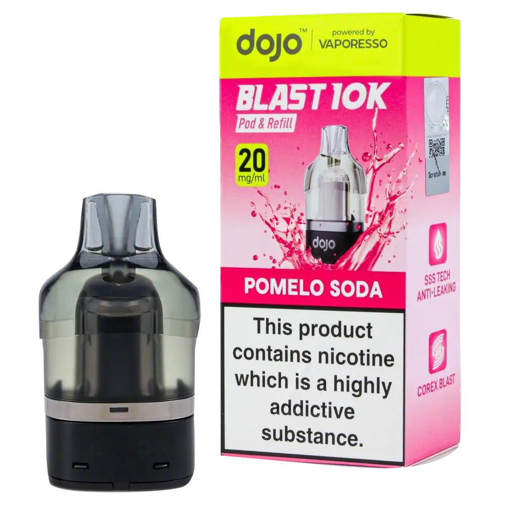 The Pomelo Soda Dojo Blast 10K refill pack offers something different from standard fruit flavours. The pomelo provides a grapefruit-like citrus taste that is slightly bitter and refreshing, whilst the soda element adds sweetness and a fizzy sensation. It is a more sophisticated citrus vape than typical lemon or lime pods.