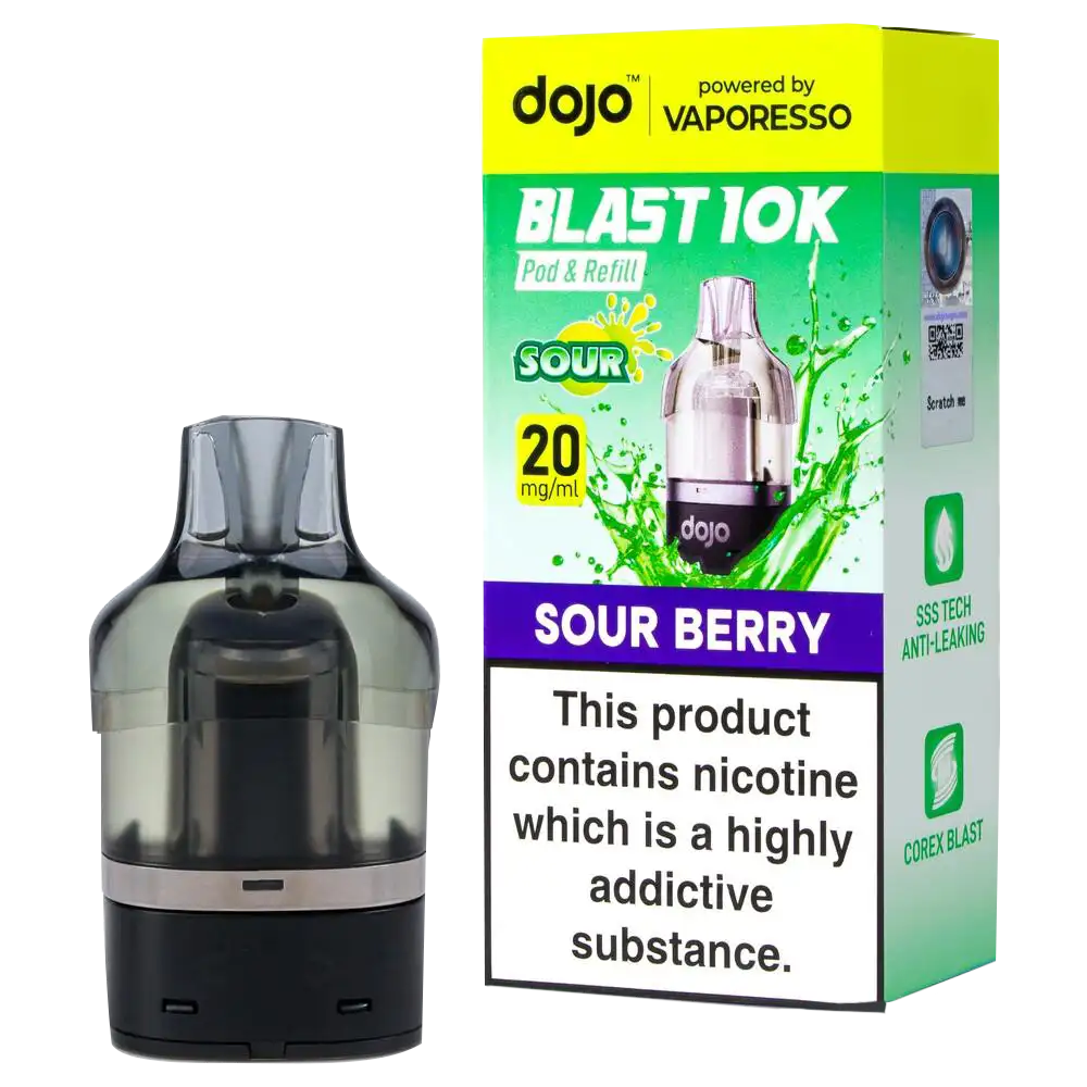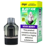 The Sour Berry Dojo Blast 10K pods combine mixed berries with tangy sourness for a fruity MTL vape. Compatible with the Dojo Blast 10K Kit and Dojo Blast 30K Kit, these prefilled pods include a 2ml pod and 8ml auto-refill container delivering up to 10,000 puffs. The Corex 2.0 mesh coil balances berry sweetness and sour notes whilst the leak-resistant design prevents spills. Each pack contains 20mg nic salt e-liquid for smooth nicotine delivery.