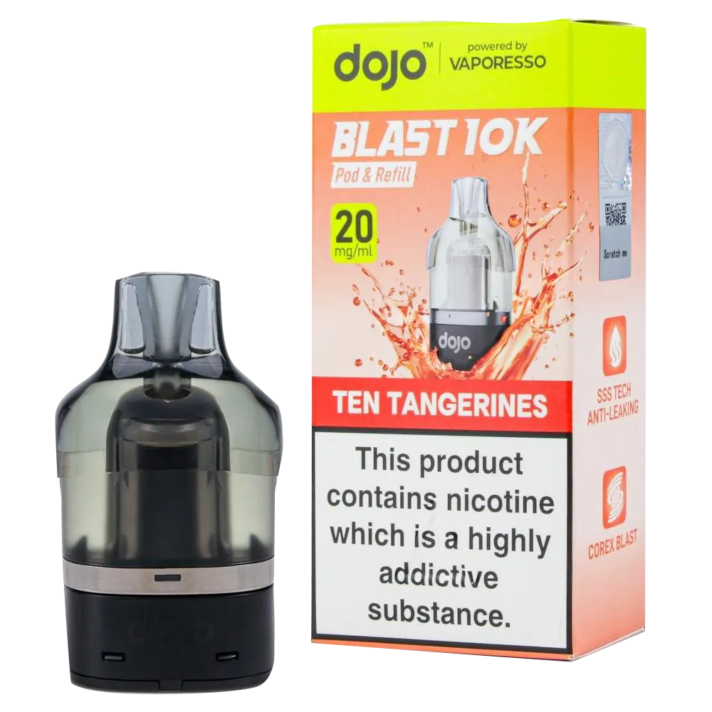 The Ten Tangerines Dojo Blast 10K pods deliver bold citrus flavour for MTL vaping. Designed for the Dojo Blast 10K Kit and Dojo Blast 30K Kit, these prefilled pods feature a 2ml TPD-compliant pod and 8ml auto-refill container providing up to 10,000 puffs. The Corex 2.0 mesh coil ensures intense tangerine taste whilst SSS leak-resistant technology prevents mess. Each pack contains 20mg nic salt for a satisfying throat hit.