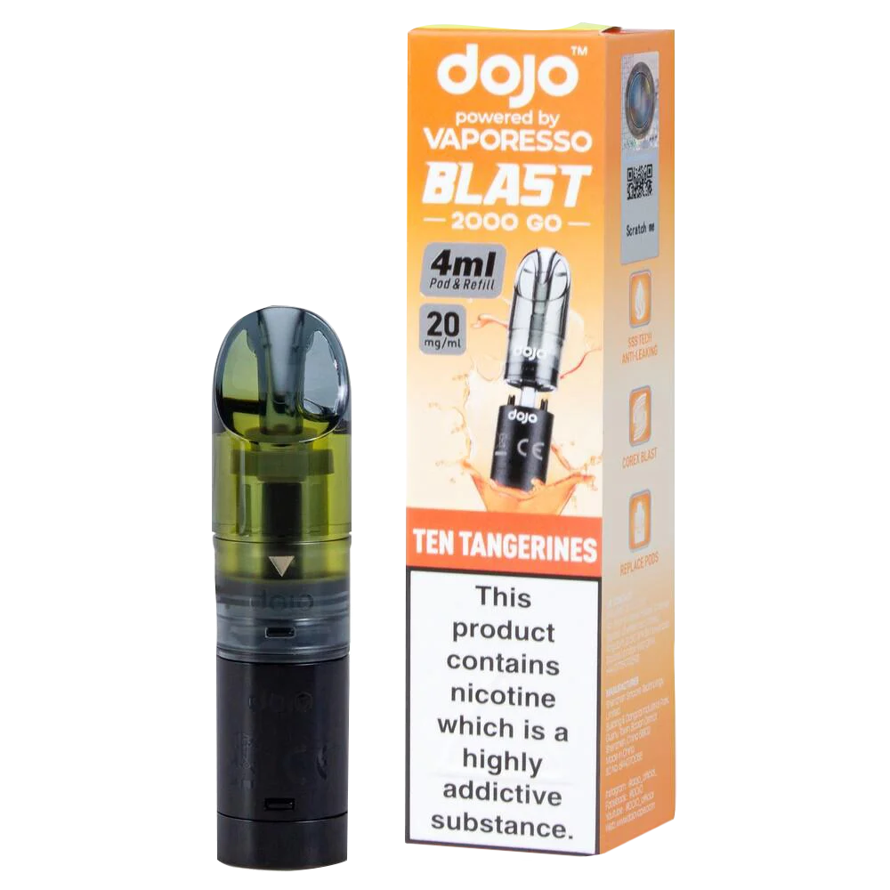 The Dojo Blast 2000 Go Ten Tangerines pods deliver intense citrus flavour with tangerine's characteristic sweetness. Designed for the Dojo Blast 2000 Go Kit and Dojo Blast 2000 Go V2 Kit, these refillable pods provide 4ml of 20mg nic salt e-liquid through a dual-pod system that doubles the capacity of standard disposables.
