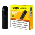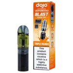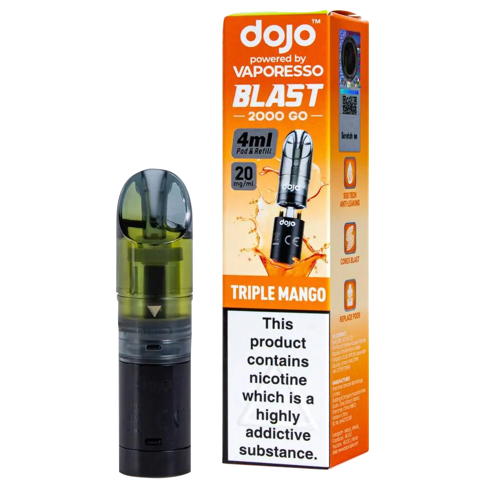 The Dojo Blast 2000 Go Triple Mango pods deliver an intense mango experience with floral undertones. Compatible with the Dojo Blast 2000 Go Kit and Dojo Blast 2000 Go V2 Kit, these prefilled pods provide 4ml of 20mg salt nicotine e-liquid through a dual-pod design that doubles the capacity of standard 2ml vapes.