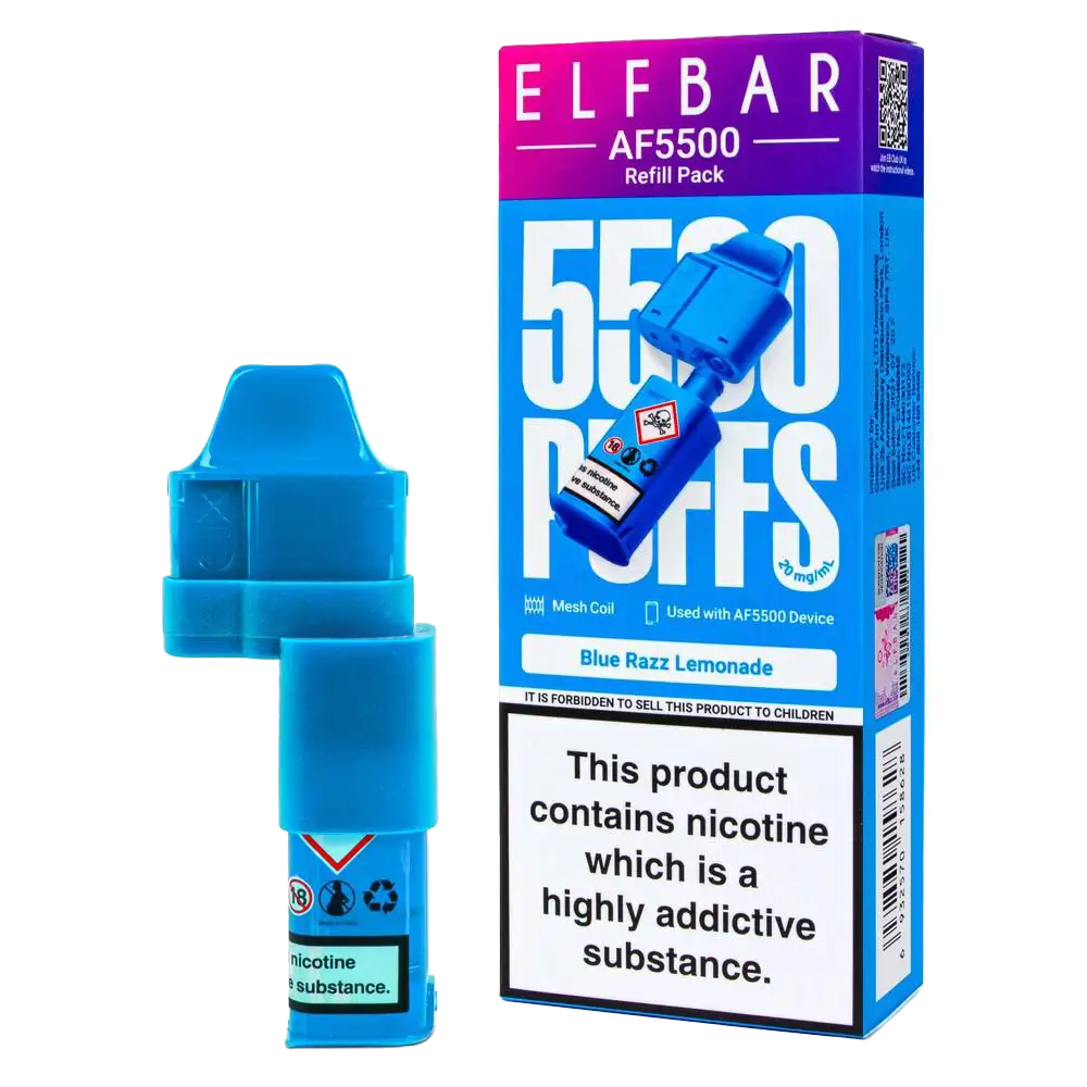 The Blue Razz Lemonade Elf Bar AF5500 refill pack brings sharp raspberry fizz with zesty lemonade, designed exclusively for the Elf Bar AF5500 Kit. This prefilled pod system pairs a TPD-compliant 2ml pod with a 10ml refill container, delivering up to 5,500 puffs of tangy sweetness. The QUAQ mesh coil ensures consistent flavour from first draw to last, making it a solid pick for vapers switching from disposables.