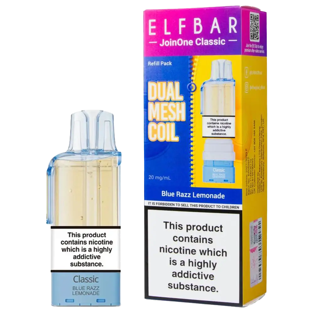 Blue Razz Lemonade JoinOne refill pods replicate the bestselling disposable flavour in extended-puff format. Designed for the Elf Bar JoinOne15 Classic, these pods combine tangy blue raspberry with fizzy lemonade for refreshing all-day vaping. The 2ml pod plus 10ml container configuration delivers 15,000 puffs of the sharp, sweet profile that made this Elf Bar's most popular flavour. The QUAQ dual mesh coil maintains the delicate balance between raspberry tartness and lemonade sweetness throughout the pod's lifespan. At 20mg nic salt strength, it provides quick satisfaction for vapers transitioning from disposables whilst the familiar taste eases adjustment to refillable pods.