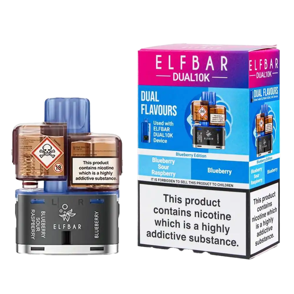 The Blueberry Edition Elf Bar Dual 10K Pods combine classic Blueberry with Blueberry Sour Raspberry across two prefilled pod systems. Each 1ml pod connects to a 5ml refill container, compatible with the Elf Bar Dual 10K Kit and Elf Bar 4in1 Ultra 50 Kit. Powered by QUAQ mesh coil technology and 20mg nic salt, these pods deliver up to 10,000 puffs with consistent blueberry intensity and subtle raspberry tartness for vapers seeking straightforward fruit flavours.