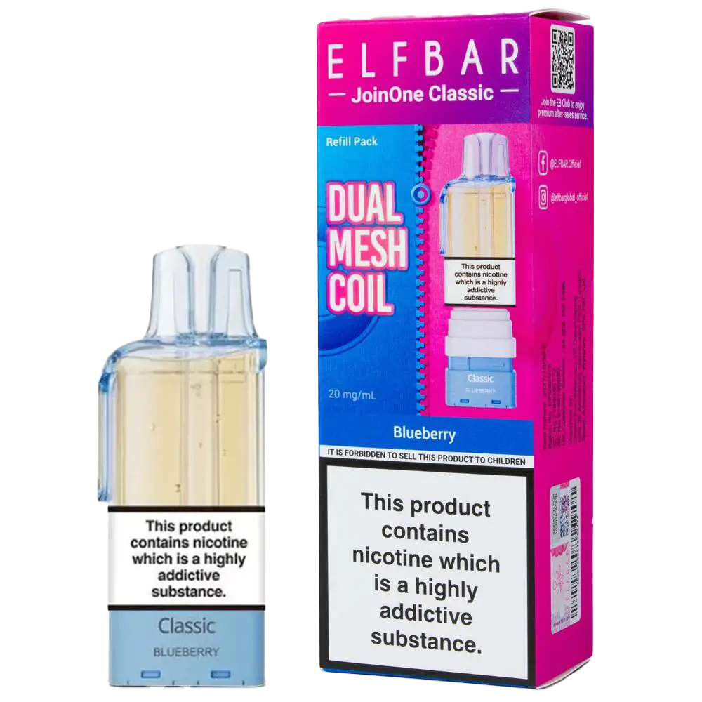The Blueberry Elf Bar JoinOne pods bring classic sweet berry flavour to vapers switching from disposables. Designed for the Elf Bar JoinOne15 Classic Kit, these prefilled pods pair a 2ml TPD-compliant cartridge with a 10ml refill container, delivering up to 15,000 puffs of authentic blueberry taste. The built-in QUAQ dual mesh coil heats e-liquid evenly for consistent flavour throughout the pod's lifespan, making it ideal for ex-smokers seeking simplicity without sacrificing satisfaction. Each pod contains 20mg nic salt e-liquid that satisfies cravings quickly whilst maintaining smooth throat hit across all three power modes. The magnetic connection clicks into place securely, whilst the automatic refill system eliminates manual top-ups and potential mess.