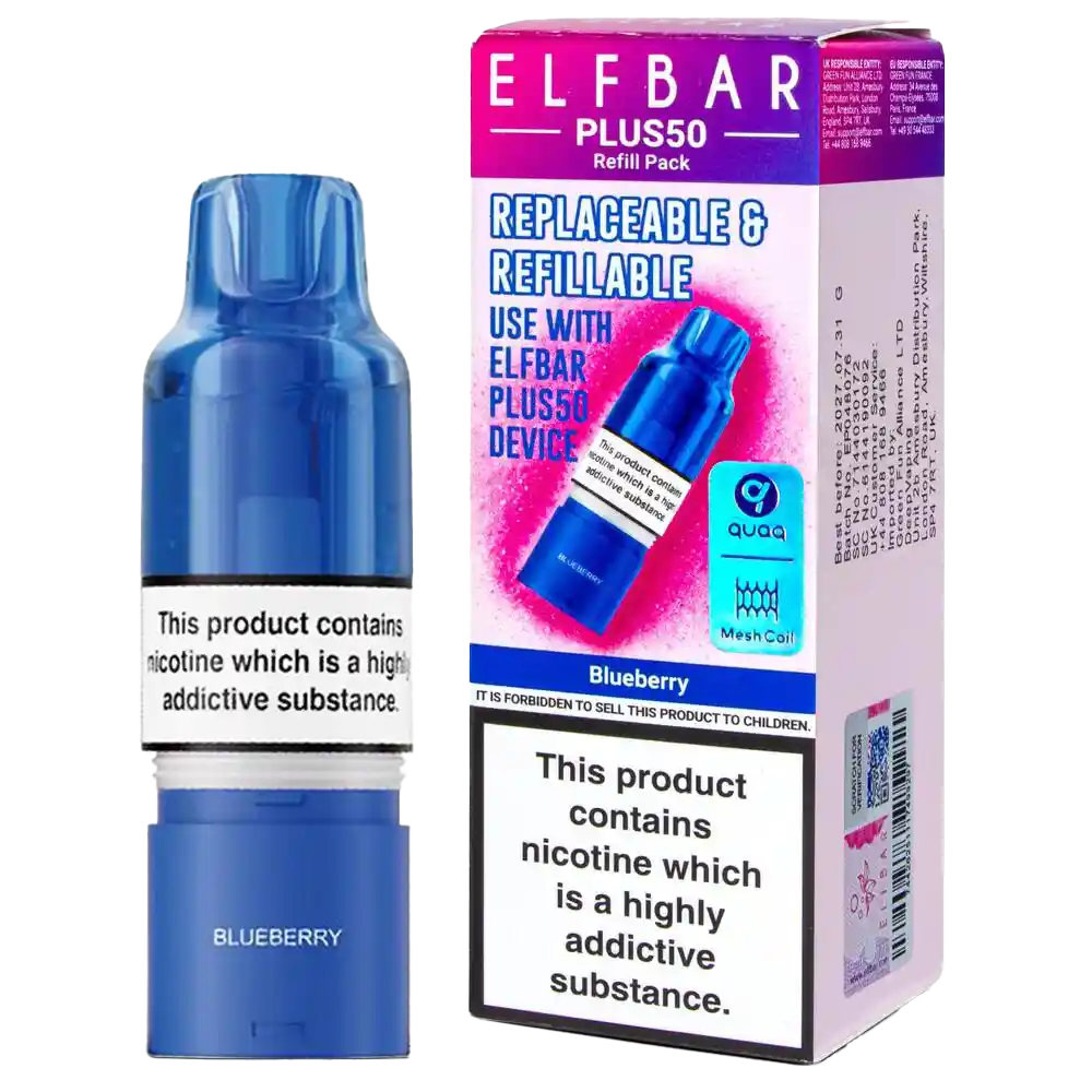 Blueberry Elf Bar Plus 50 pods deliver pure, uncomplicated blueberry flavour through a refillable pod design that outlasts disposables. Each pack includes a 2ml pod and 8ml refill container, both prefilled with 20mg nic salt e-liquid for smooth, fast nicotine satisfaction. Designed for the Elf Bar Plus 50 Kit and Plus 15 Kit, these pods offer up to 5,500 puffs via a 0.8Ω QUAQ mesh coil that maintains the sweet blueberry profile throughout.
