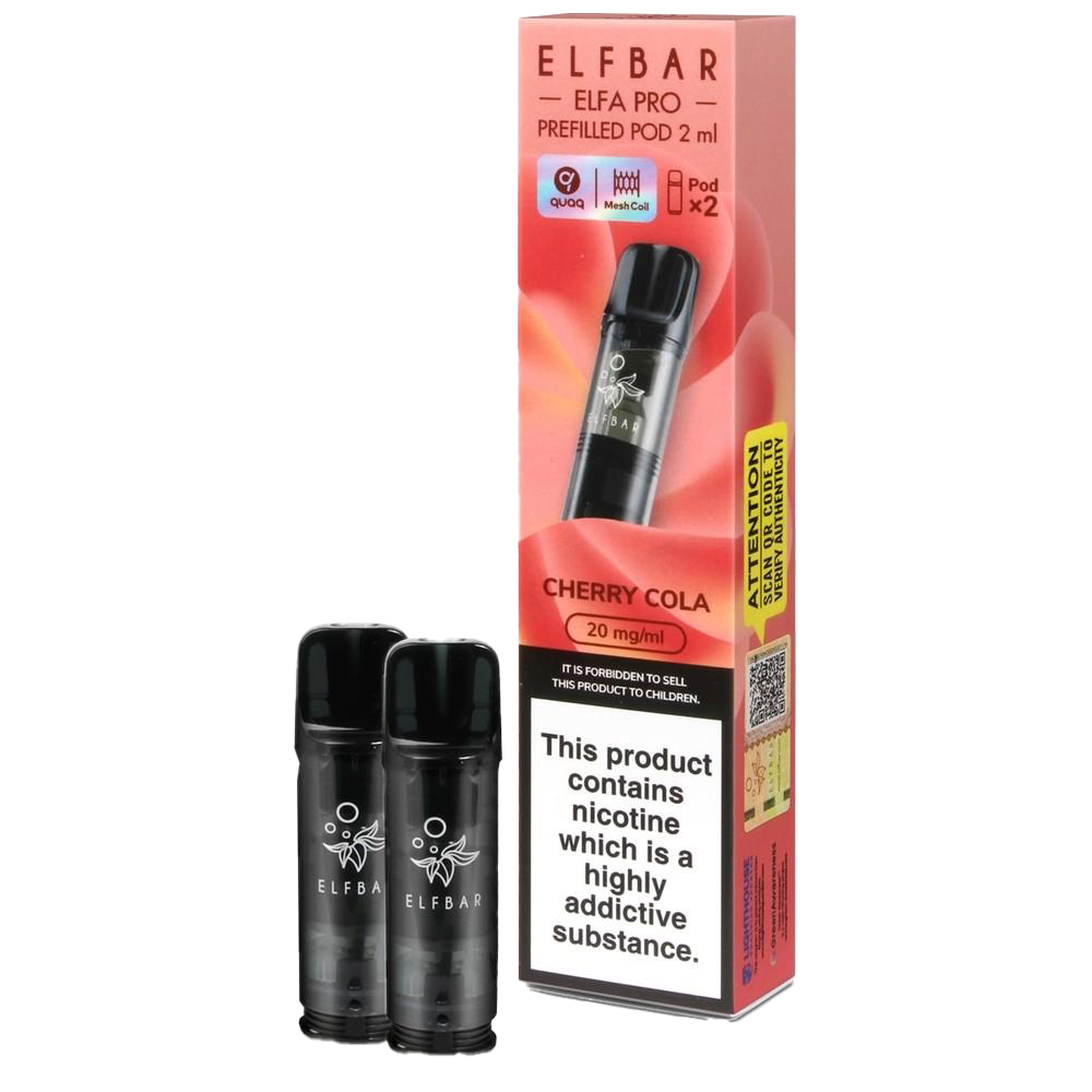 These prefilled pods deliver a cherry cola beverage flavour for the Elfa Pro and Elfa kits. Each 2ml TPD compliant pod contains 20mg nic salt e-liquid, providing approximately 600 puffs. Compatible with Elf Bar Elfa Pro, Elfa, Elf Bar 600, Lost Mary Tappo, and Elfa Turbo devices, they click in magnetically. The QUAQ mesh coil maintains the fizzy cola and cherry notes consistently.