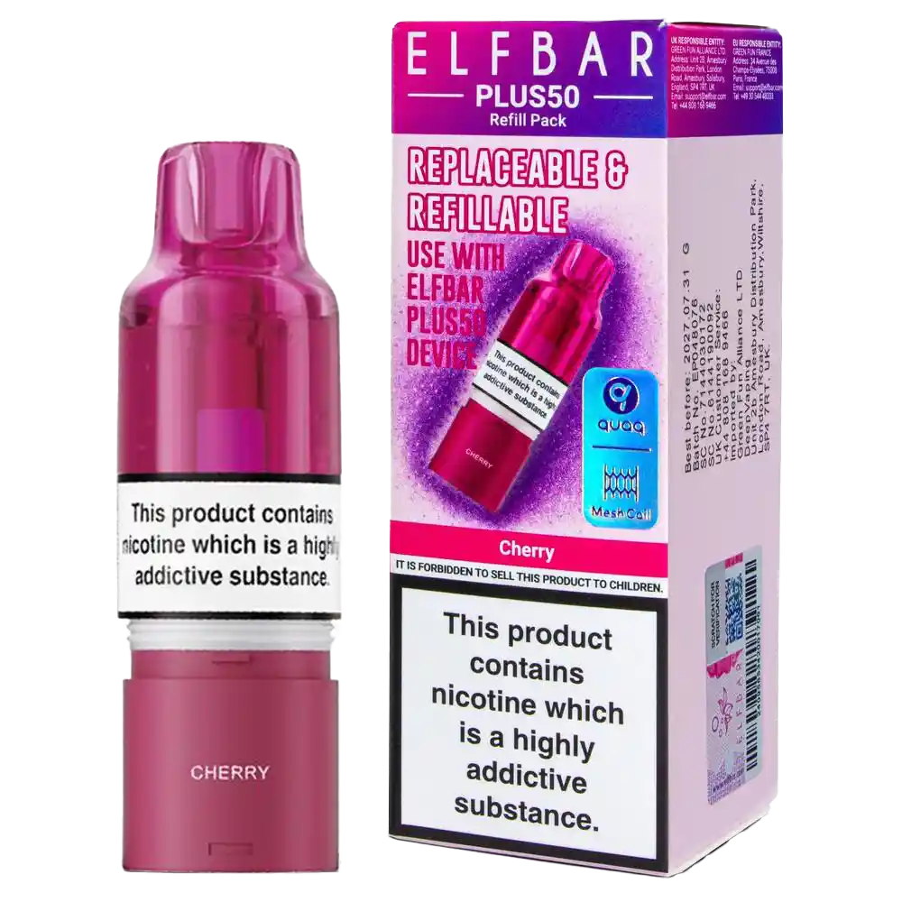 0.8Ω QUAQ Mesh Coil – Dual mesh structure heats e-liquid efficiently, maintaining rich cherry sweetness from start to finish without muting or metallic aftertaste. Auto-Refilling Design – 8ml container feeds the 2ml pod as you vape, eliminating manual top-ups and extending usage between replacements. 20mg Nic Salt E-Liquid – Fast-absorbing formula satisfies cravings quickly with a gentler throat hit than freebase alternatives, ideal for ex-smokers. Clear Pod Window – Monitor remaining liquid level at a glance, preventing dry hits and knowing exactly when to swap in a fresh pack. Dual Device Compatibility – Works with both Elf Bar Plus 50 and Plus 15 kits, offering flexibility across the prefilled range.