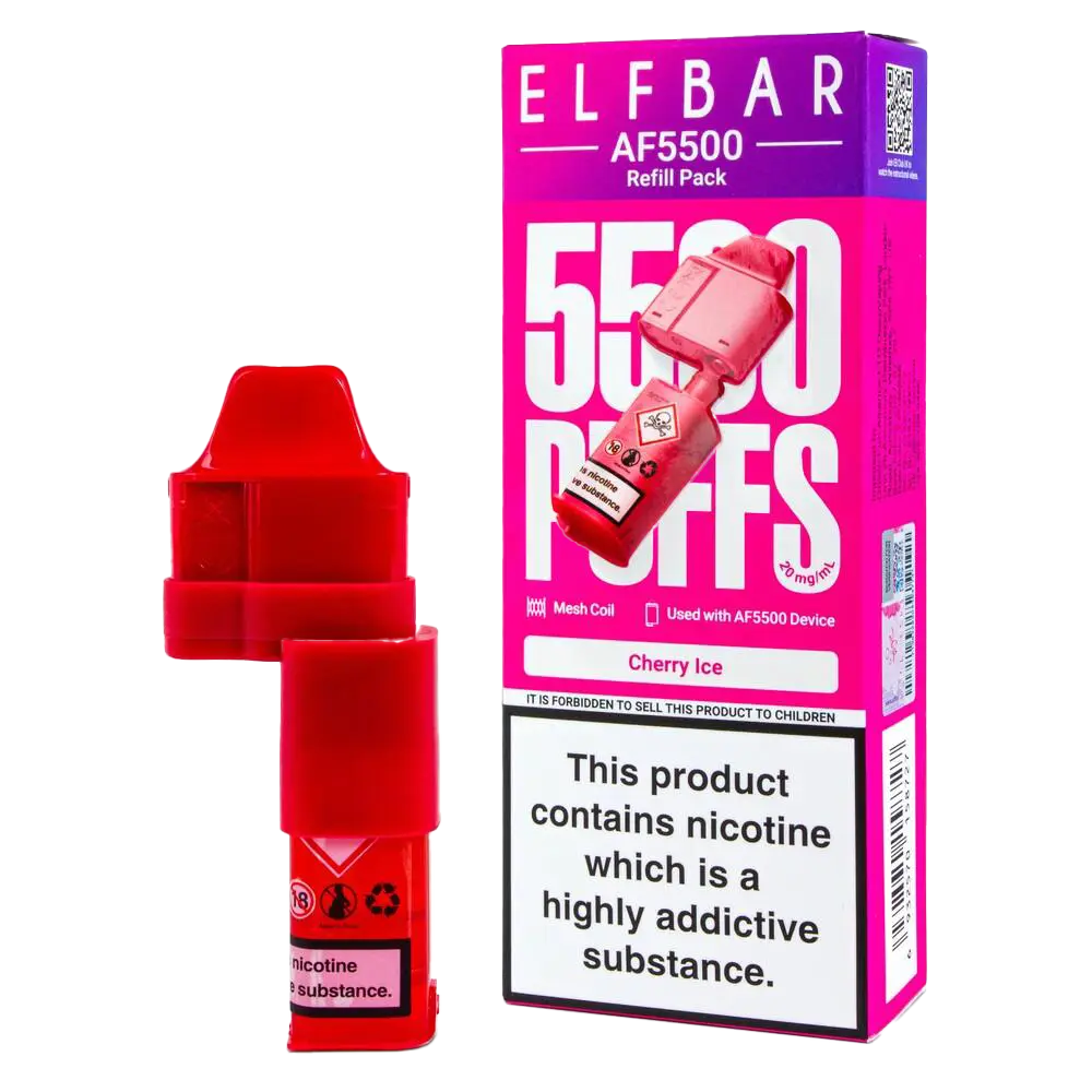 Cherry Ice Elf Bar AF5500 pods blend dark cherry sweetness with icy menthol, engineered for the Elf Bar AF5500 Kit. This refillable pod pairs a 2ml TPD-compliant chamber with a 10ml auto-refill container, pushing puff counts to 5,500. The QUAQ mesh coil preserves cherry depth while the menthol finish keeps each draw crisp, appealing to vapers who want bold fruit with a cooling edge.
