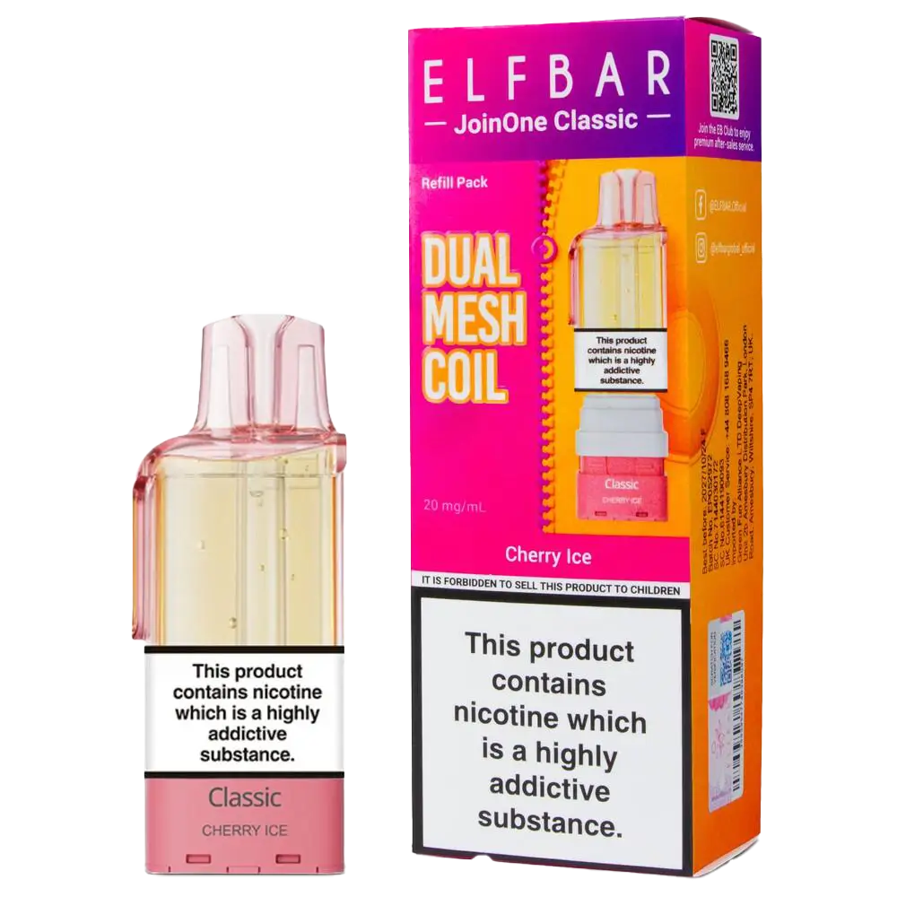 Cherry Ice JoinOne pods deliver sweet cherry fruit with cooling menthol finish for vapers wanting refreshing flavour complexity. These prefilled pods fit the Elf Bar JoinOne15 Classic Kit, combining 2ml TPD-compliant capacity with 10ml refill container for 15,000 total puffs. The icy exhale prevents cherry sweetness from overwhelming your palate during extended sessions. Built-in QUAQ dual mesh coils heat the 20mg nic salt e-liquid evenly, maintaining both cherry authenticity and cooling intensity throughout the pod's lifespan. The magnetic connection ensures secure fitting whilst the auto-refill system transfers liquid automatically as you vape.