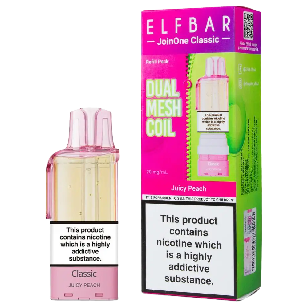 Juicy Peach JoinOne pods bring ripe stone fruit flavour to vapers seeking mellow sweetness. Compatible with Elf Bar JoinOne15 Classic, these pods combine 2ml cartridge with 10ml container for 15,000 puffs of smooth peach taste. The dual mesh coil captures peach's natural sweetness without artificial aftertaste. The 20mg nic salt formulation provides gentle throat hit that complements peach's soft character, making this particularly suitable for vapers who find sharper fruits too intense. Auto-refill technology maintains consistent flavour whilst the magnetic fitting ensures secure connection.