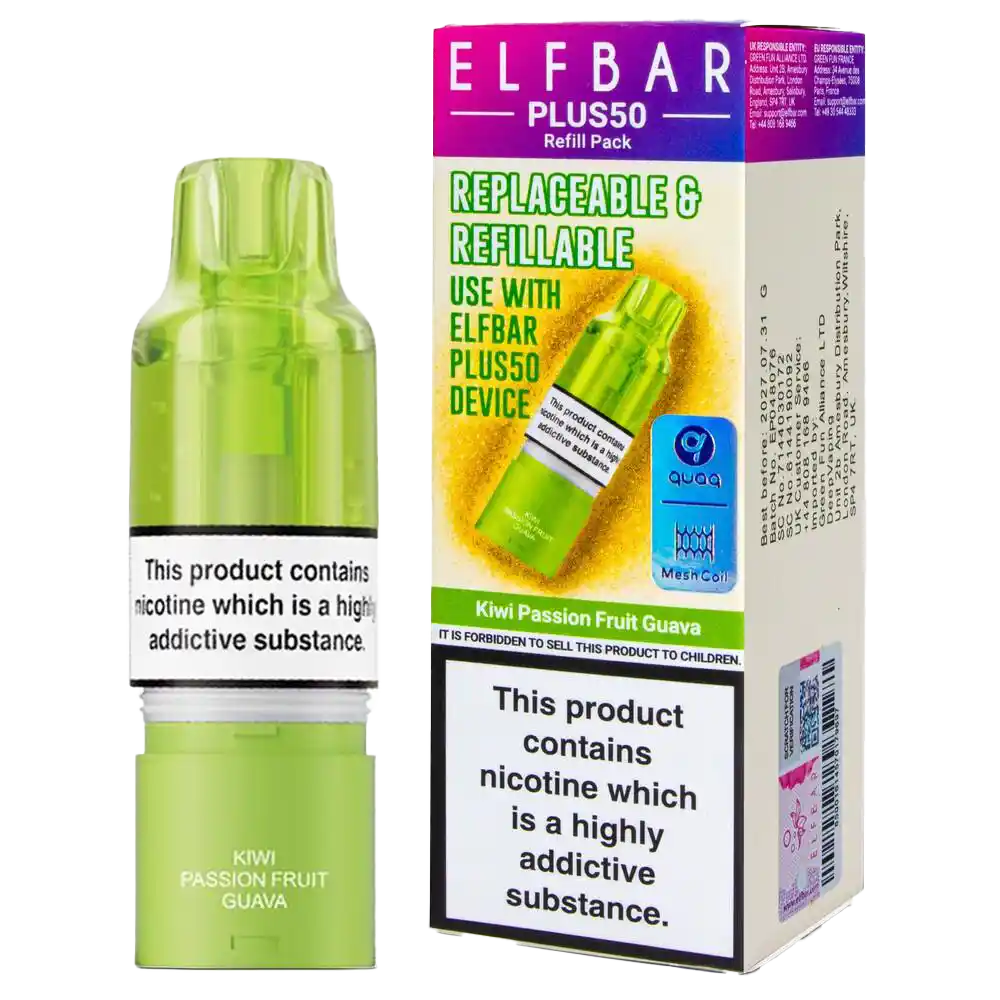 Kiwi Passion Fruit Guava Elf Bar Plus 50 pods deliver a tropical trio through a refillable pod system that cuts disposable waste. Each pack pairs a 2ml pod with an 8ml refill container, both filled with 20mg nic salt e-liquid for smooth, rapid nicotine satisfaction. Designed for the Elf Bar Plus 50 Kit and Plus 15 Kit, these pods offer up to 5,500 puffs via a 0.8Ω QUAQ mesh coil that keeps the layered fruit notes distinct throughout.