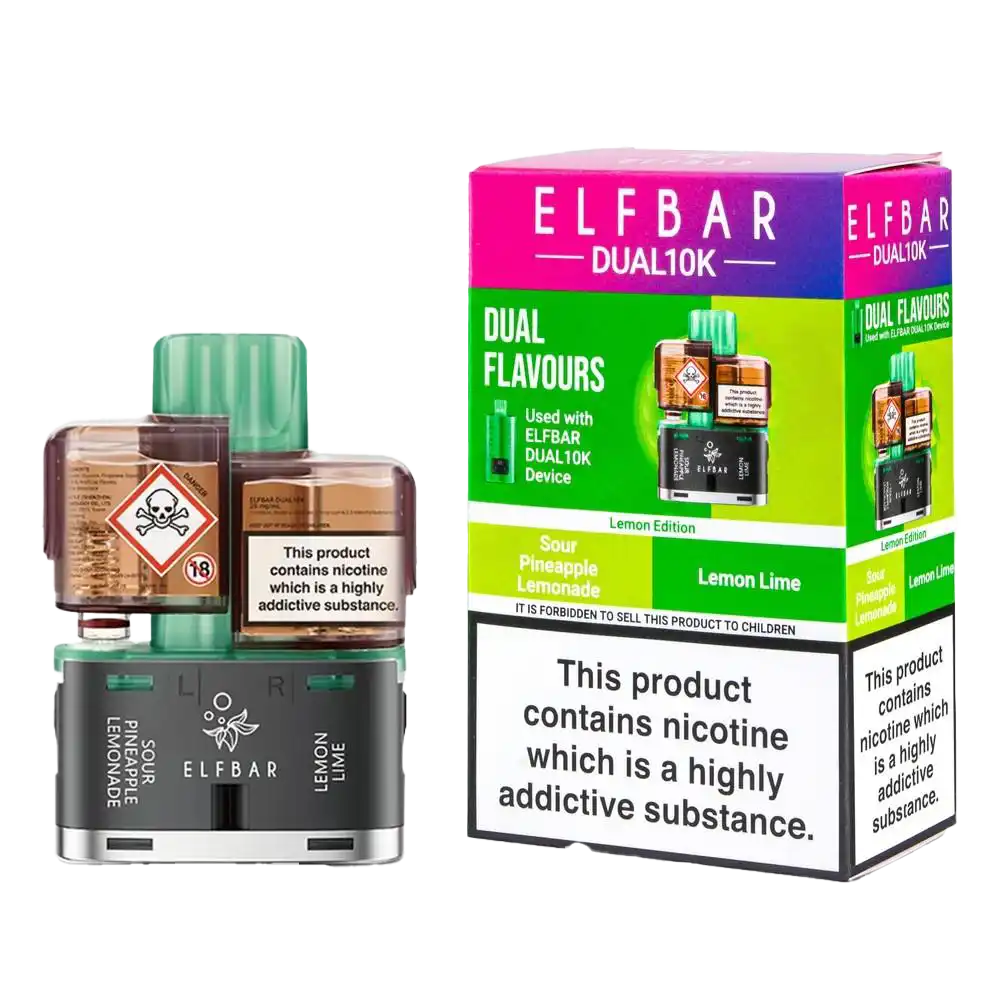 The Lemon Edition Elf Bar Dual 10K Pods pair Lemon Lime with Sour Pineapple Lemonade across two prefilled pods, each backed by 5ml refill containers. Designed for the Elf Bar Dual 10K Kit and Elf Bar 4in1 Ultra 50 Kit, these pods feature QUAQ mesh coil technology and 20mg nic salt to deliver up to 10,000 puffs. They provide instant switching between classic citrus and tropical lemonade profiles for vapers who prefer tart, refreshing flavours.