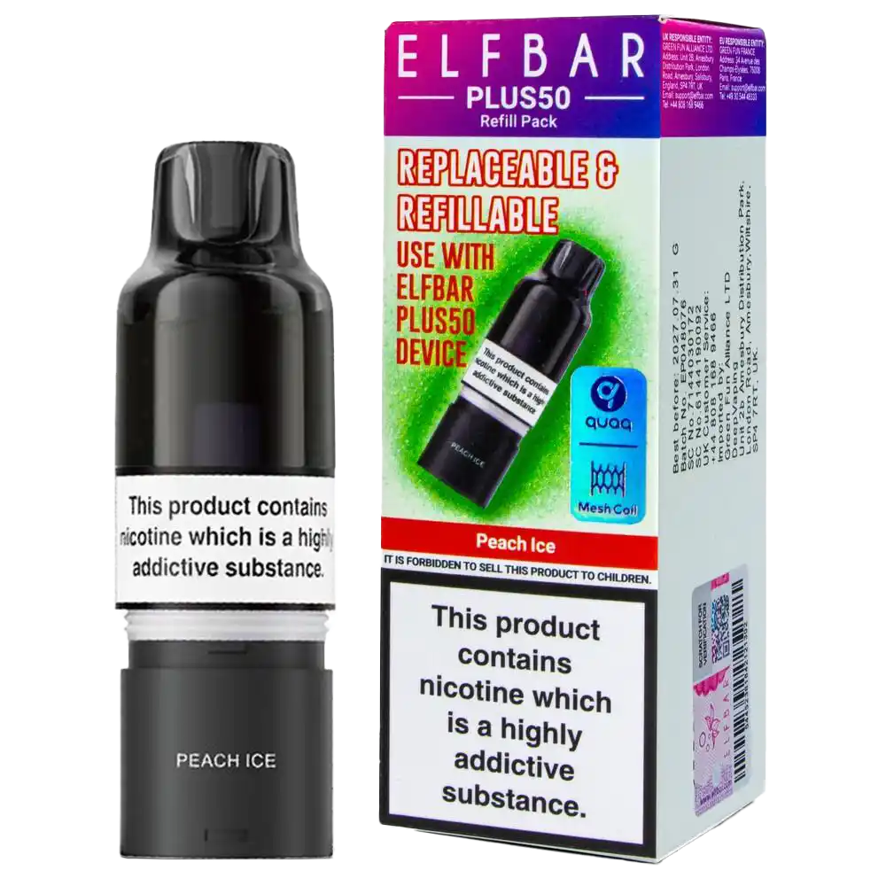 Peach Ice Elf Bar Plus 50 pods bring juicy peach sweetness with a cooling finish to a refillable pod setup that outlasts disposables. Each pack combines a 2ml TPD compliant pod with an 8ml refill container, both filled with 20mg nic salt e-liquid for smooth, rapid craving relief. Compatible with the Elf Bar Plus 50 Kit and Plus 15 Kit, these pods deliver up to 5,500 puffs through a 0.8Ω QUAQ mesh coil designed for consistent flavour depth.