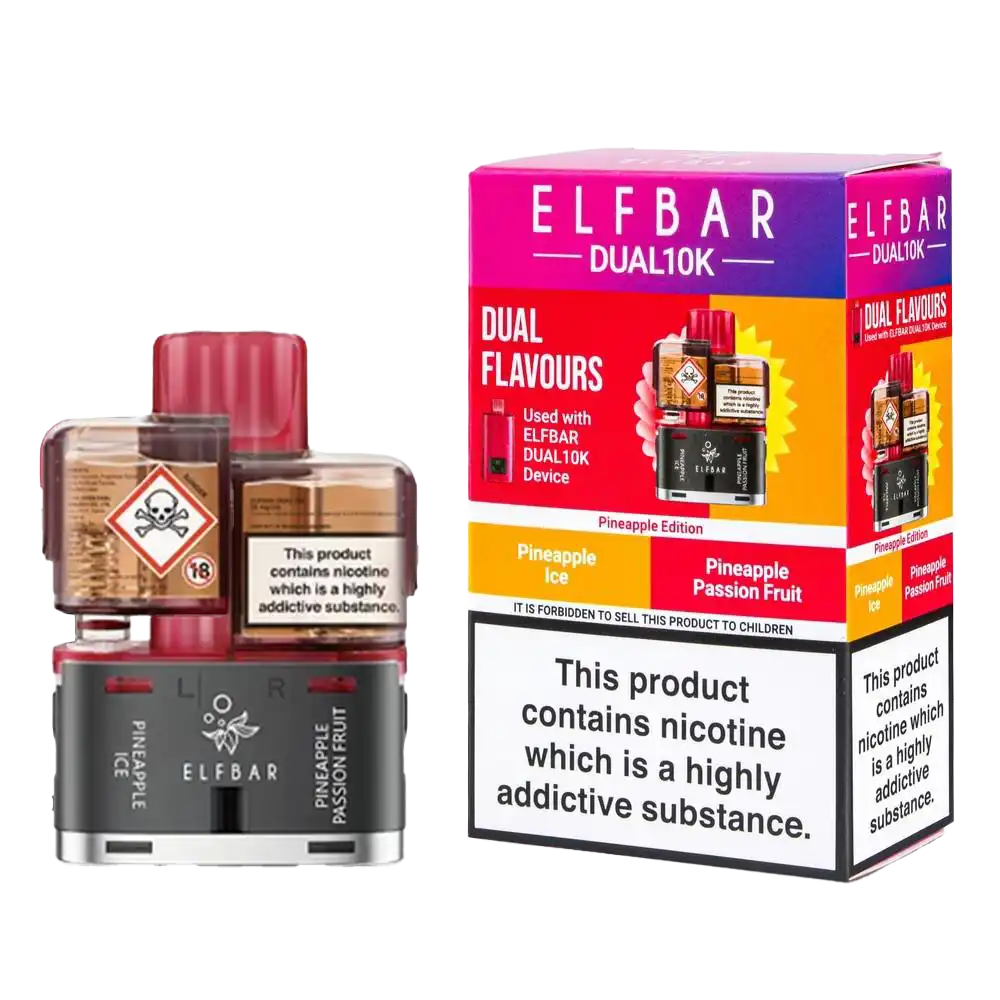 The Pineapple Edition Elf Bar Dual 10K Pods feature Pineapple Ice with Pineapple Passion Fruit across dual prefilled pod systems. Each pack includes two 1ml pods and 5ml refill containers, compatible with the Elf Bar Dual 10K Kit and Elf Bar 4in1 Ultra 50 Kit. Using QUAQ mesh coil technology and 20mg nic salt, these pods deliver up to 10,000 puffs with cooling pineapple on one side and tropical fruit blend on the other.