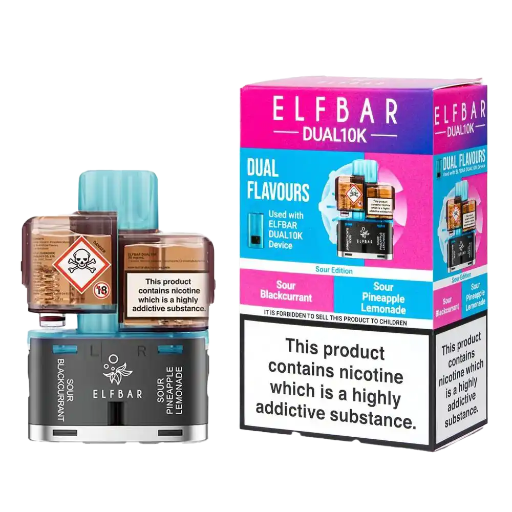 The Sour Edition Elf Bar Dual 10K Pods pair Sour Blackcurrant with Sour Pineapple Lemonade across dual prefilled pod systems. Each pack includes two 1ml pods and 5ml refill containers, compatible with the Elf Bar Dual 10K Kit and Elf Bar 4in1 Ultra 50 Kit. Powered by QUAQ mesh coil technology and 20mg nic salt, these pods deliver up to 10,000 puffs with sharp, tart fruit profiles for vapers who prefer acidity over sweetness.