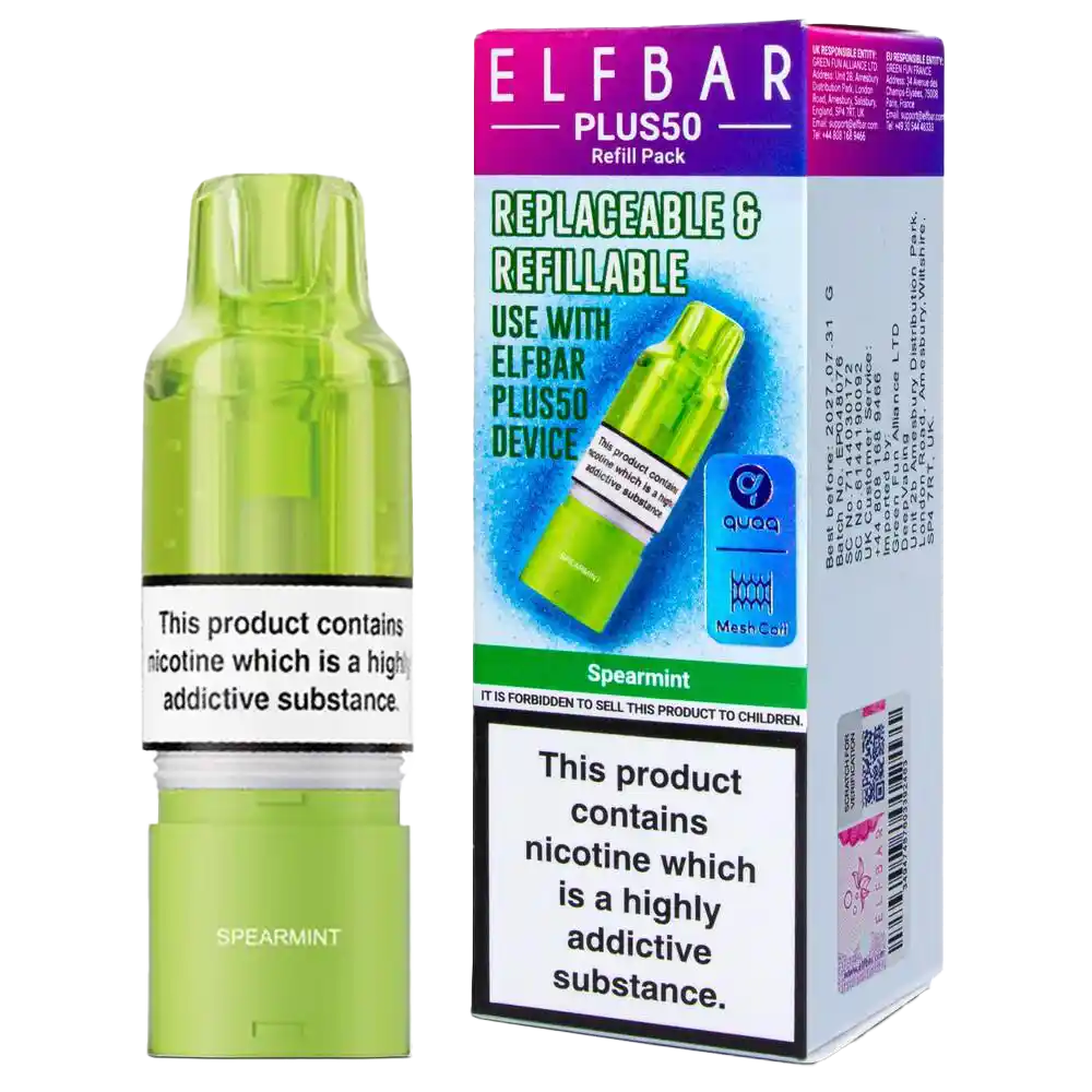 0.8Ω QUAQ Dual Mesh Coil – Enhanced coil design heats e-liquid efficiently, maintaining fresh spearmint clarity from first puff to last without muting or metallic aftertaste. 2ml + 8ml Prefilled System – Pod and refill container work together to maintain optimal liquid levels, extending usage far beyond standard 2ml-only pods. 20mg Salt Nicotine – Higher concentration delivers faster craving satisfaction with a smoother throat sensation than traditional freebase nicotine. Clear Pod Window – Monitor remaining liquid level at a glance, preventing dry hits and knowing exactly when to swap in a fresh pack. Universal Compatibility – Designed for Elf Bar Plus 50 and Plus 15 devices, allowing seamless flavour switching across the prefilled range.