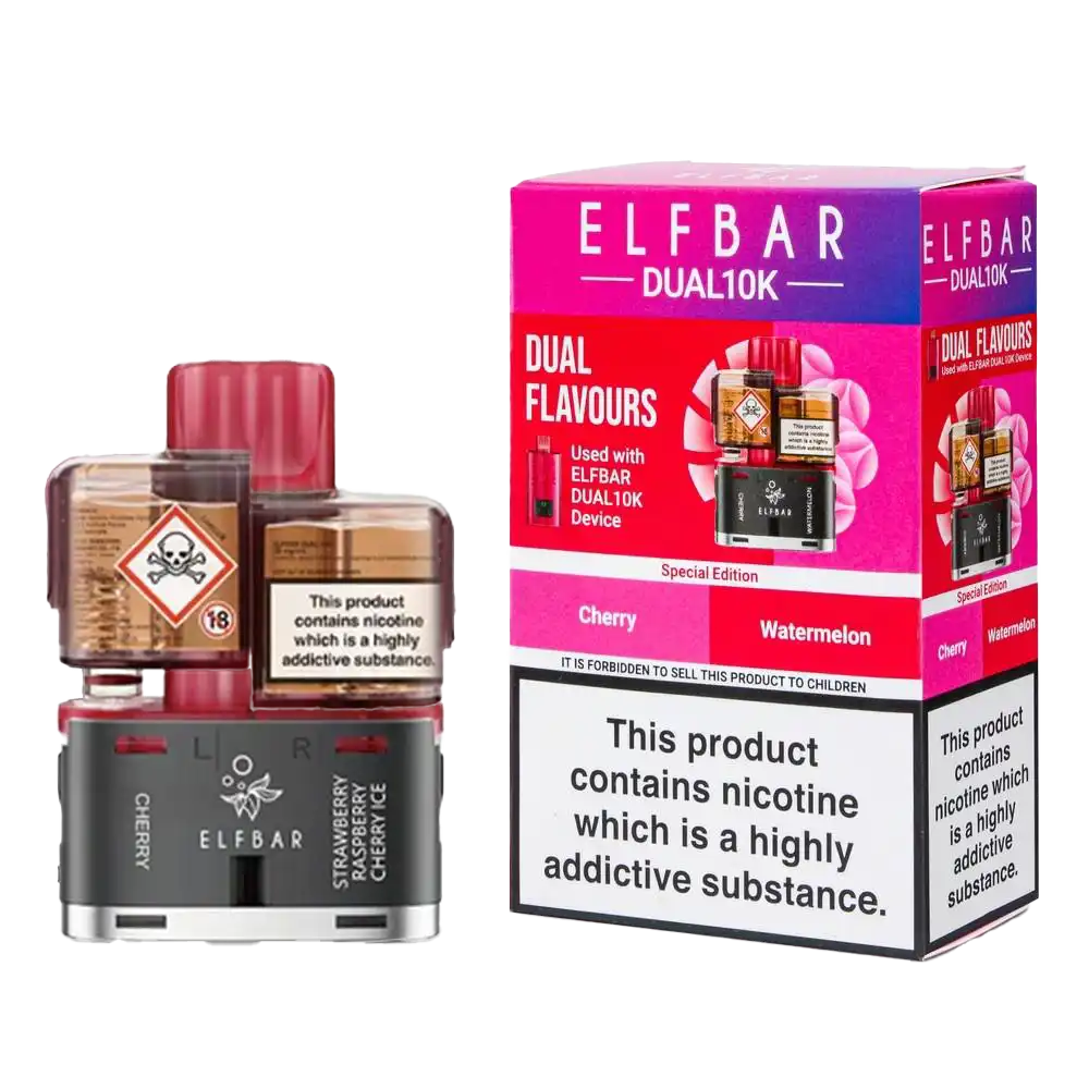 The Special Edition Elf Bar Dual 10K Pods combine classic Cherry with Watermelon across two prefilled pods, each with 5ml refill containers. Designed for the Elf Bar Dual 10K Kit and Elf Bar 4in1 Ultra 50 Kit, these pods feature QUAQ mesh coil technology and 20mg nic salt to deliver up to 10,000 puffs. They offer instant switching between sweet stone fruit and refreshing melon for straightforward, universally appealing fruit profiles.