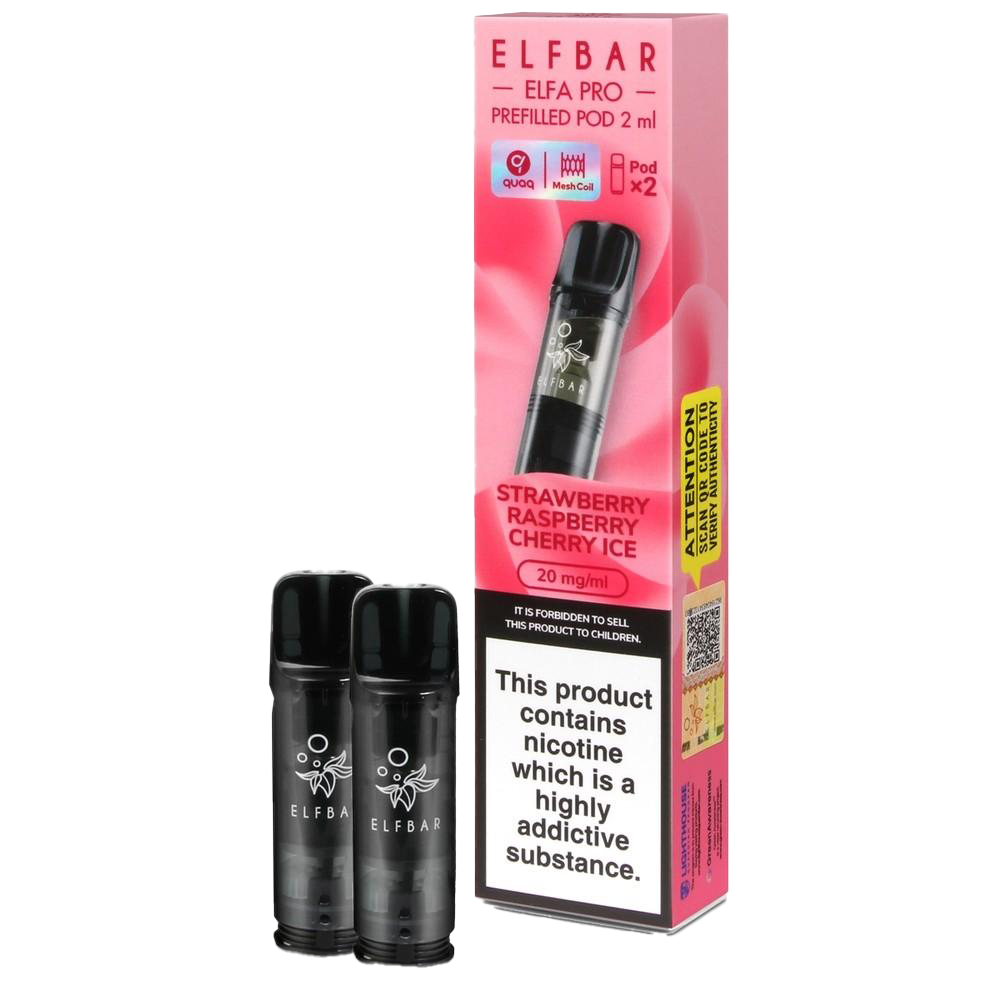 These prefilled pods combine three berries with ice for the Elfa Pro and Elfa systems. Each 2ml pod holds 20mg nic salt e-liquid, delivering up to 600 puffs. Compatible with Elf Bar Elfa Pro, Elfa, Elf Bar 600, Lost Mary Tappo, and Elfa Turbo kits, they connect instantly. The QUAQ mesh coil ensures the strawberry, raspberry, cherry, and ice elements blend consistently.