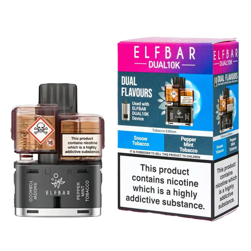The Tobacco Edition Elf Bar Dual 10K Pods feature Pepper Mint Tobacco with Snoow Tobacco across dual prefilled pod systems. Each pack includes two 1ml pods and 5ml refill containers, designed for the Elf Bar Dual 10K Kit and Elf Bar 4in1 Ultra 50 Kit. Powered by QUAQ mesh coil technology and 20mg nic salt, these pods deliver up to 10,000 puffs with traditional tobacco profiles—one with mint cooling, the other smooth and mellow.