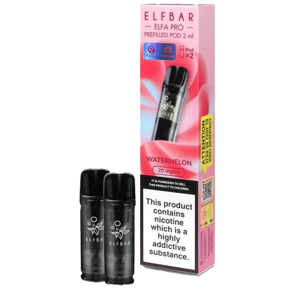 These prefilled pods offer a simple watermelon vape for the Elfa Pro and Elfa kits. Each 2ml TPD compliant pod contains 20mg nic salt e-liquid, providing approximately 600 puffs. Compatible with Elf Bar Elfa Pro, Elfa, Elf Bar 600, Lost Mary Tappo, and Elfa Turbo devices, they click in magnetically. The QUAQ mesh coil maintains the sweet, juicy watermelon flavour consistently.