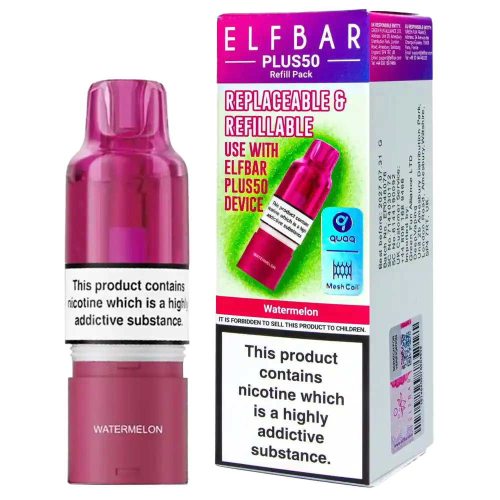 Watermelon Elf Bar Plus 50 pods bring refreshing, juicy melon flavour to a refillable pod system that outlasts disposables without added complexity. Each pack includes a 2ml pod and 8ml refill container, both prefilled with 20mg nic salt e-liquid for smooth, fast nicotine satisfaction. Designed for the Elf Bar Plus 50 Kit and Elf Bar Plus 15 Kit, these pods deliver up to 5,500 puffs through a 0.8Ω QUAQ mesh coil that maintains the sweet watermelon profile throughout.