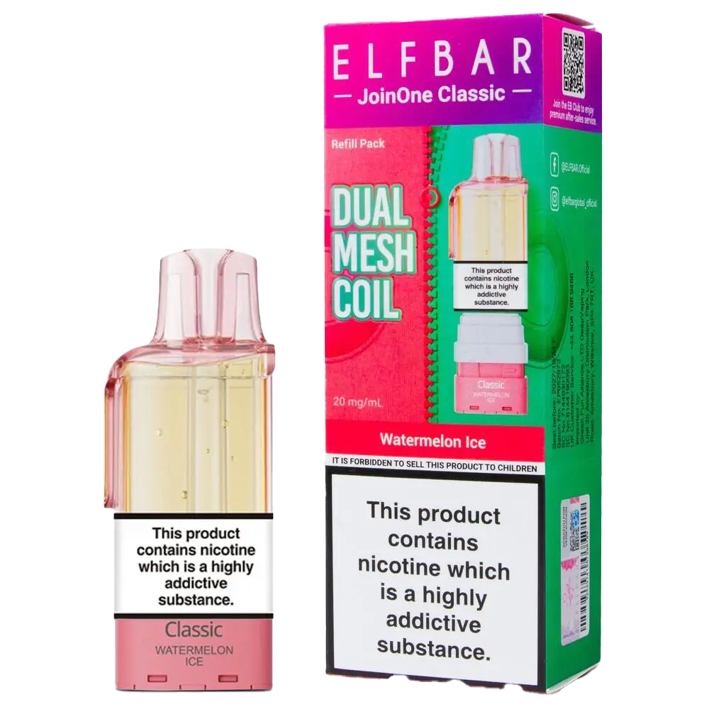 Watermelon Ice JoinOne refill pods combine juicy melon with cooling menthol for refreshing summer-style vape. These pods work with Elf Bar JoinOne15 Classic Kit, delivering 15,000 puffs through 2ml cartridge and 10ml container system. The dual mesh coil balances watermelon sweetness with ice coolness throughout each draw. Each pod contains 20mg nic salt e-liquid providing smooth throat hit enhanced by cooling effect. The TPD-compliant design ensures legal UK use whilst auto-refill technology maintains consistent flavour without manual intervention or leaking concerns.