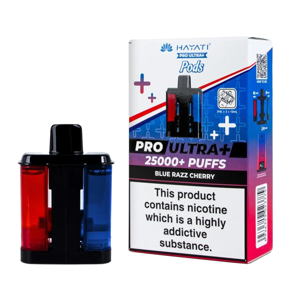 Blue Razz Cherry combines the popular blue raspberry with a deep cherry note. This refill pack for the Hayati Pro Ultra Plus features two identical pods/tanks with 22ml of 20mg nic salt. Ideally suited for berry lovers who want a bit more body than a standard blue razz. The dual mesh coils heat the liquid evenly to produce a rich, dark fruit vapour. Up to 25,000 puffs of intense berry flavour.