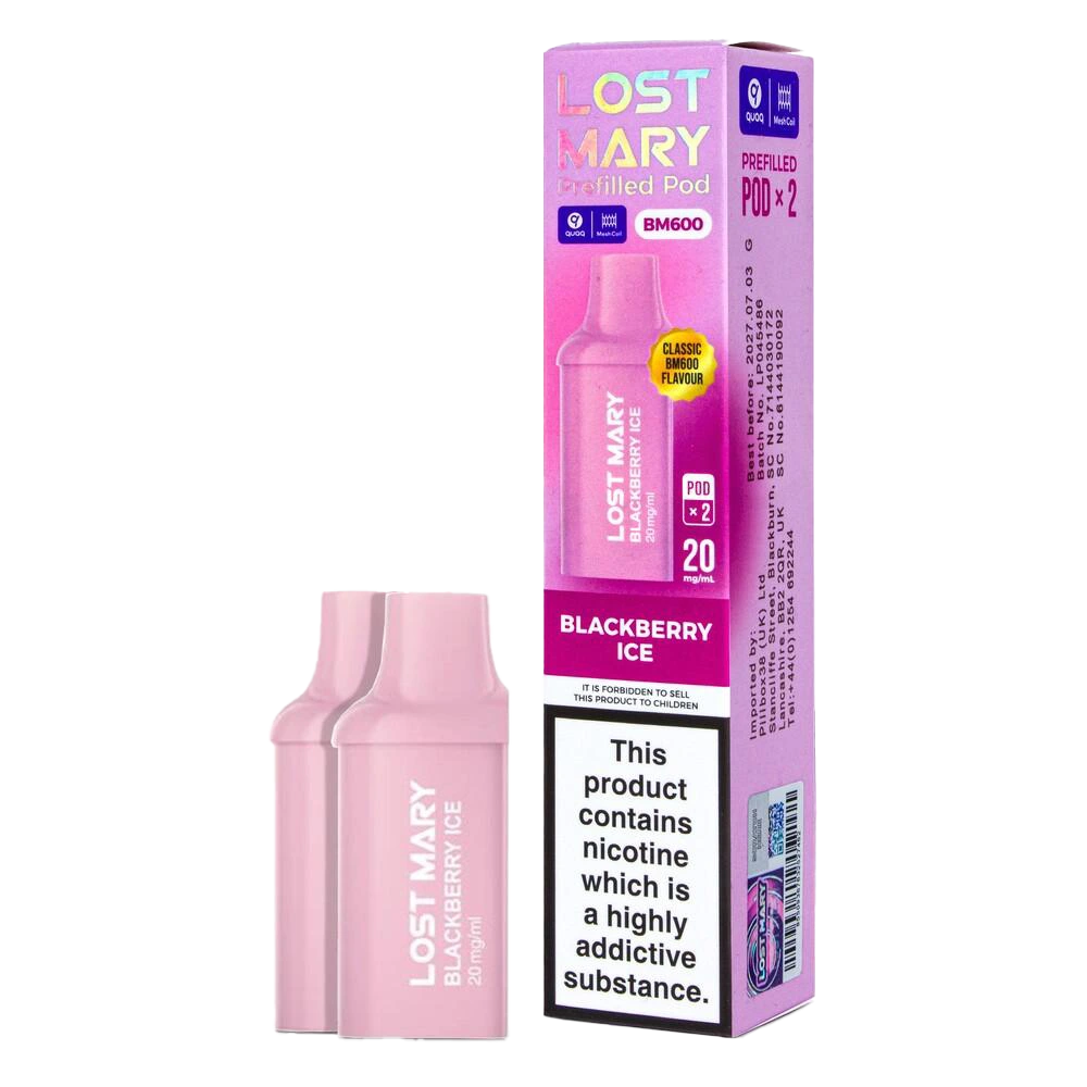 Lost Mary BM600 Blackberry Ice prefilled pods deliver 20mg salt nicotine and a tart dark berry flavour with a chilled finish, powered by QUAQ mesh coils.