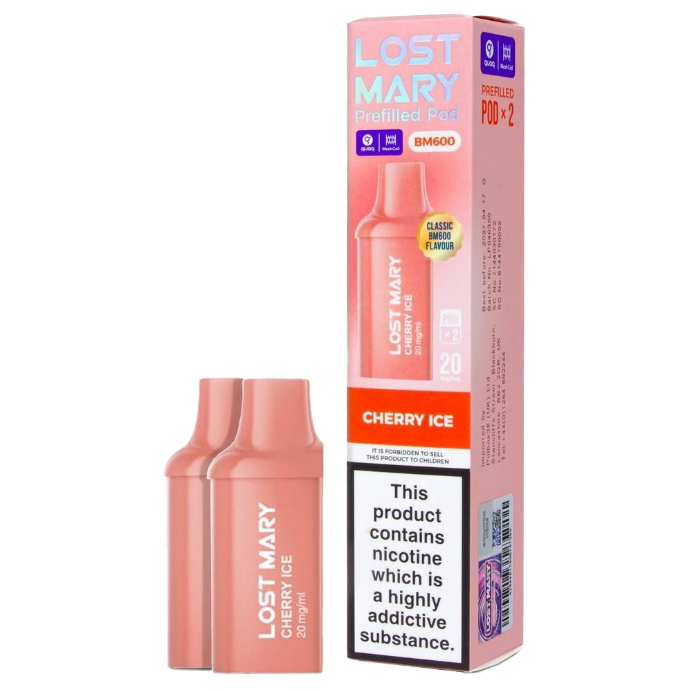Cherry Ice delivers sweet cherry flavour with a menthol finish on exhale. These prefilled pods suit the Lost Mary BM600 Pod Kit and match the disposable's flavour in a format you can replace. The cherry leans towards candy rather than fresh fruit, backed by a moderate ice hit that refreshes without overwhelming. Designed for the BM600 pod system exclusively.