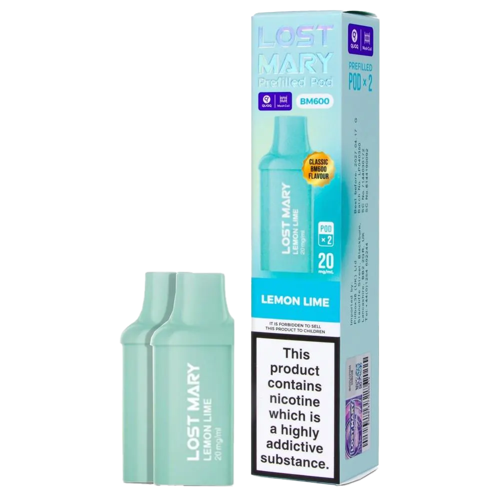 Lost Mary BM600 replacement pods feature 2ml of 20mg nic salt e-liquid and a QUAQ mesh coil, delivering a sharp, refreshing lemon and lime citrus blend for MTL vaping.