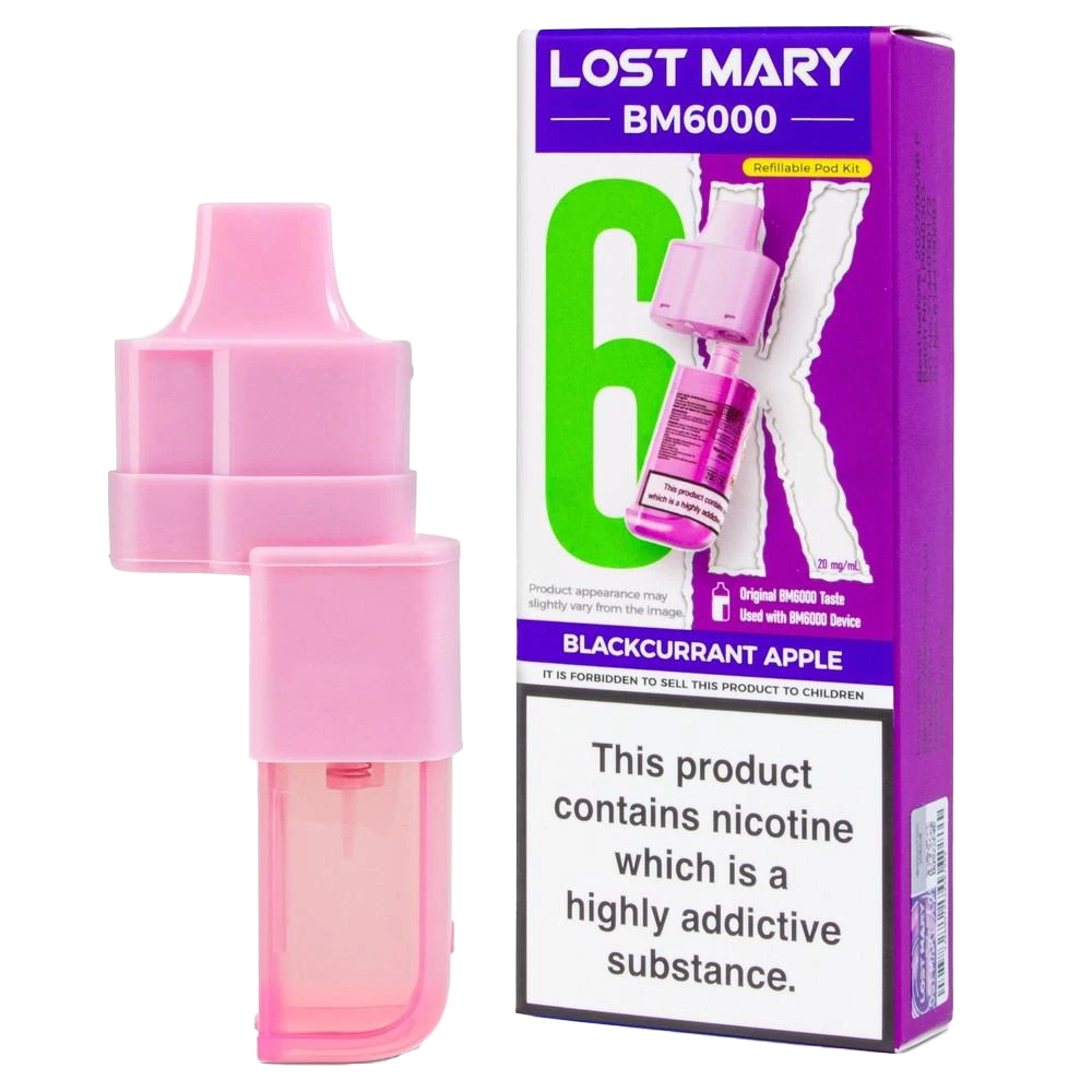 Lost Mary BM6000 prefilled pods combine a 2ml pod and 10ml refill for 6000 puffs, featuring 20mg nic salt and dual mesh coils for a classic blackcurrant apple MTL vape.