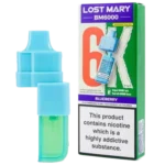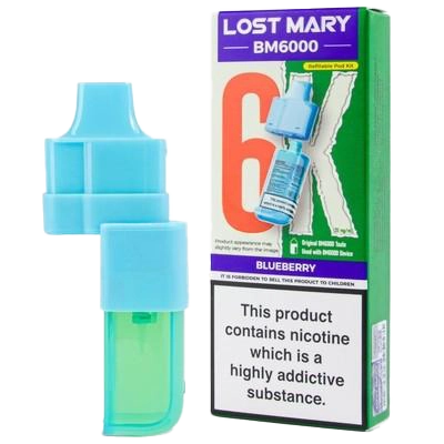 Lost Mary BM6000 prefilled pods combine a 2ml pod and 10ml refill for 6000 puffs, featuring multiple nicotine strengths and dual mesh coils for a jammy blueberry MTL vape.