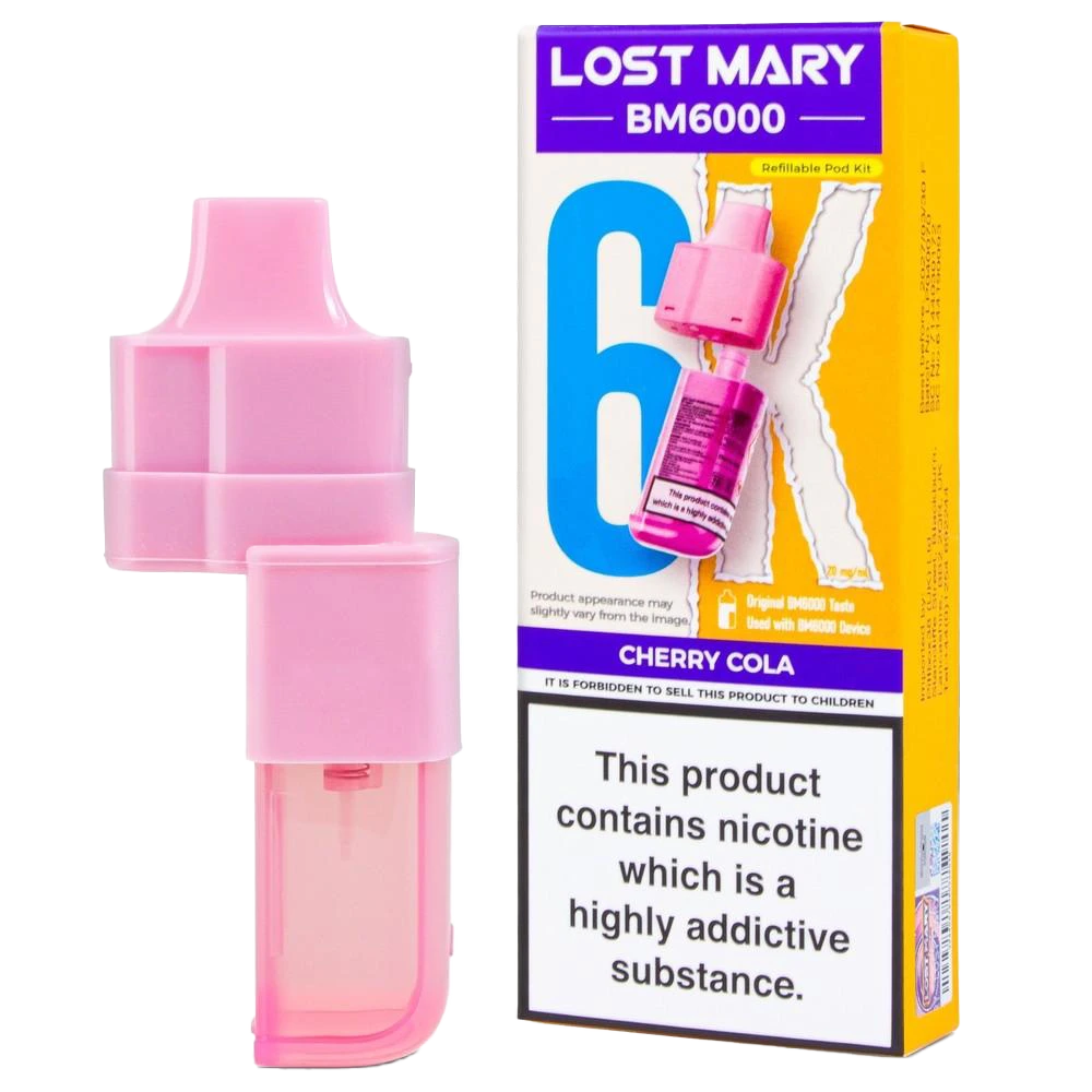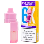 Lost Mary BM6000 prefilled pods combine a 2ml pod and 10ml refill for 6000 puffs, featuring 20mg nic salt and dual mesh coils for a nostalgic cherry cola MTL vape.