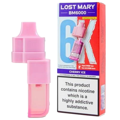 Lost Mary BM6000 prefilled pods combine a 2ml pod and 10ml refill for 6000 puffs, featuring 20mg nic salt and dual mesh coils for a candied cherry and ice MTL vape.