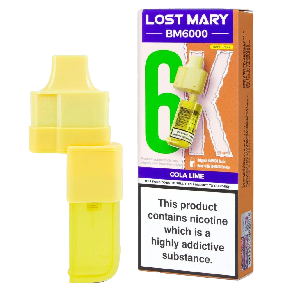 Lost Mary BM6000 prefilled pods combine a 2ml pod and 10ml refill for 6000 puffs, featuring 20mg nic salt and dual mesh coils for a zesty cola lime MTL vape.
