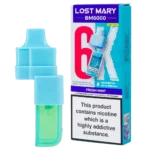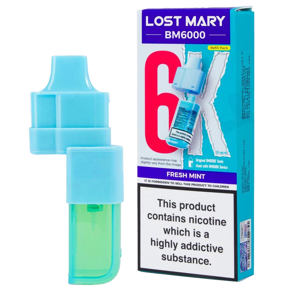 Lost Mary BM6000 prefilled pods combine a 2ml pod and 10ml refill for 6000 puffs, featuring 20mg nic salt and dual mesh coils for a sweet fresh mint MTL vape.