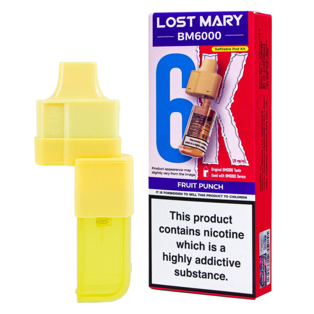 Lost Mary BM6000 prefilled pods combine a 2ml pod and 10ml refill for 6000 puffs, featuring 20mg nic salt and dual mesh coils for a nostalgic fruit punch MTL vape.