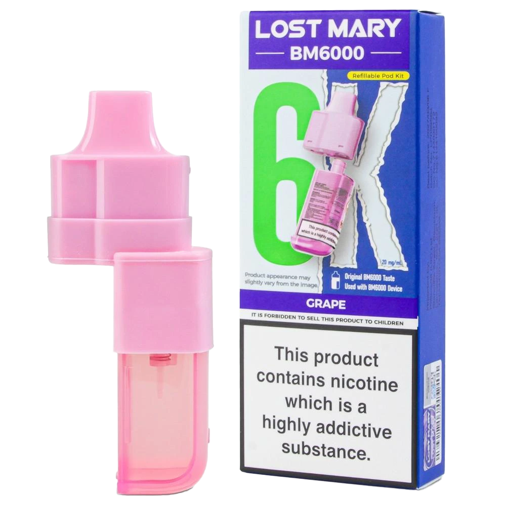 Lost Mary BM6000 prefilled pods combine a 2ml pod and 10ml refill for 6000 puffs, featuring 20mg nic salt and dual mesh coils for a sweet, ice-free grape MTL vape.