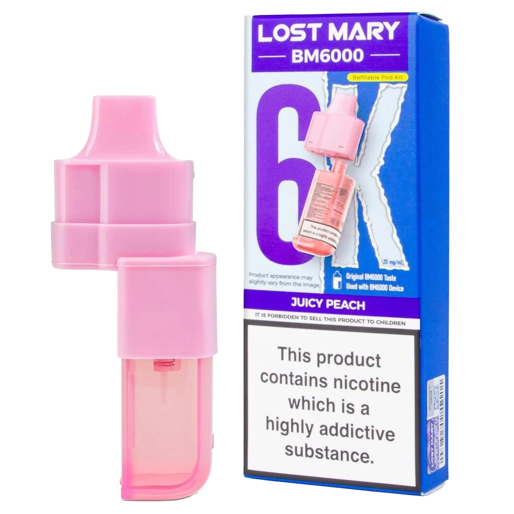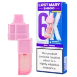 Lost Mary BM6000 prefilled pods combine a 2ml pod and 10ml refill for 6000 puffs, featuring 20mg nic salt and dual mesh coils for a delicate juicy peach MTL vape.