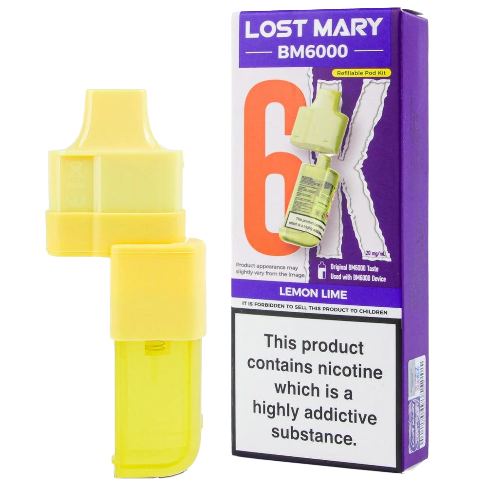 Lost Mary BM6000 prefilled pods combine a 2ml pod and 10ml refill for 6000 puffs, featuring 20mg nic salt and dual mesh coils for a zesty lemon lime MTL vape.
