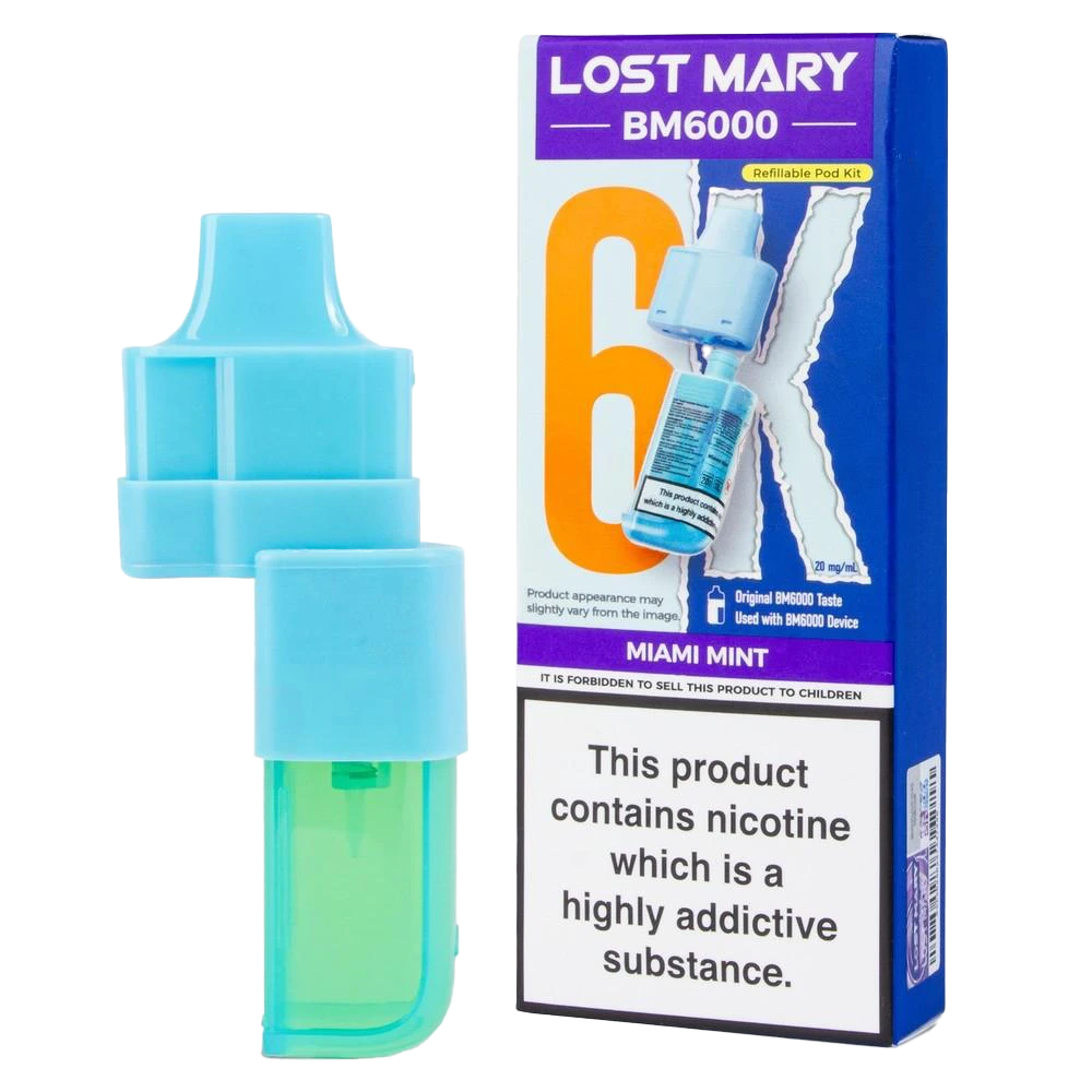 Lost Mary BM6000 prefilled pods combine a 2ml pod and 10ml refill for 6000 puffs, featuring 20mg nic salt and dual mesh coils for a zesty Miami Mint MTL vape.
