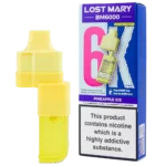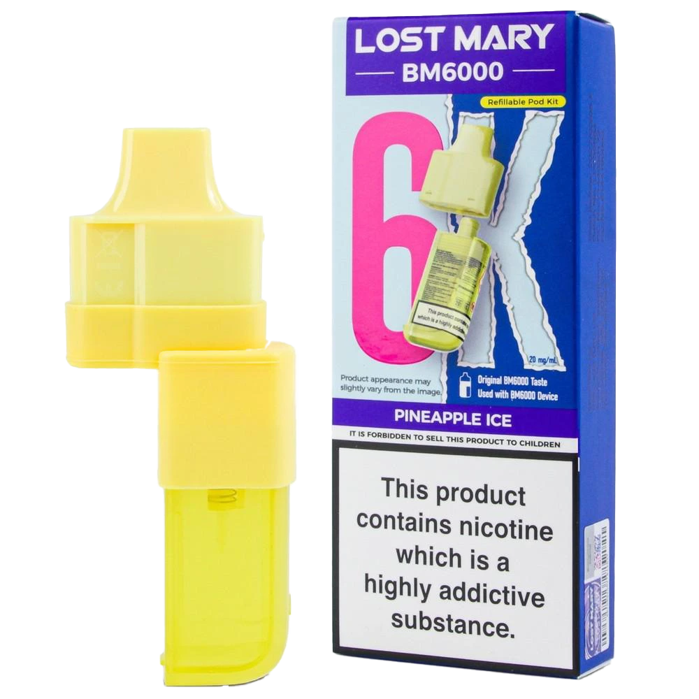 Lost Mary BM6000 prefilled pods combine a 2ml pod and 10ml refill for 6000 puffs, featuring 20mg nic salt and dual mesh coils for a tropical pineapple and ice MTL vape.