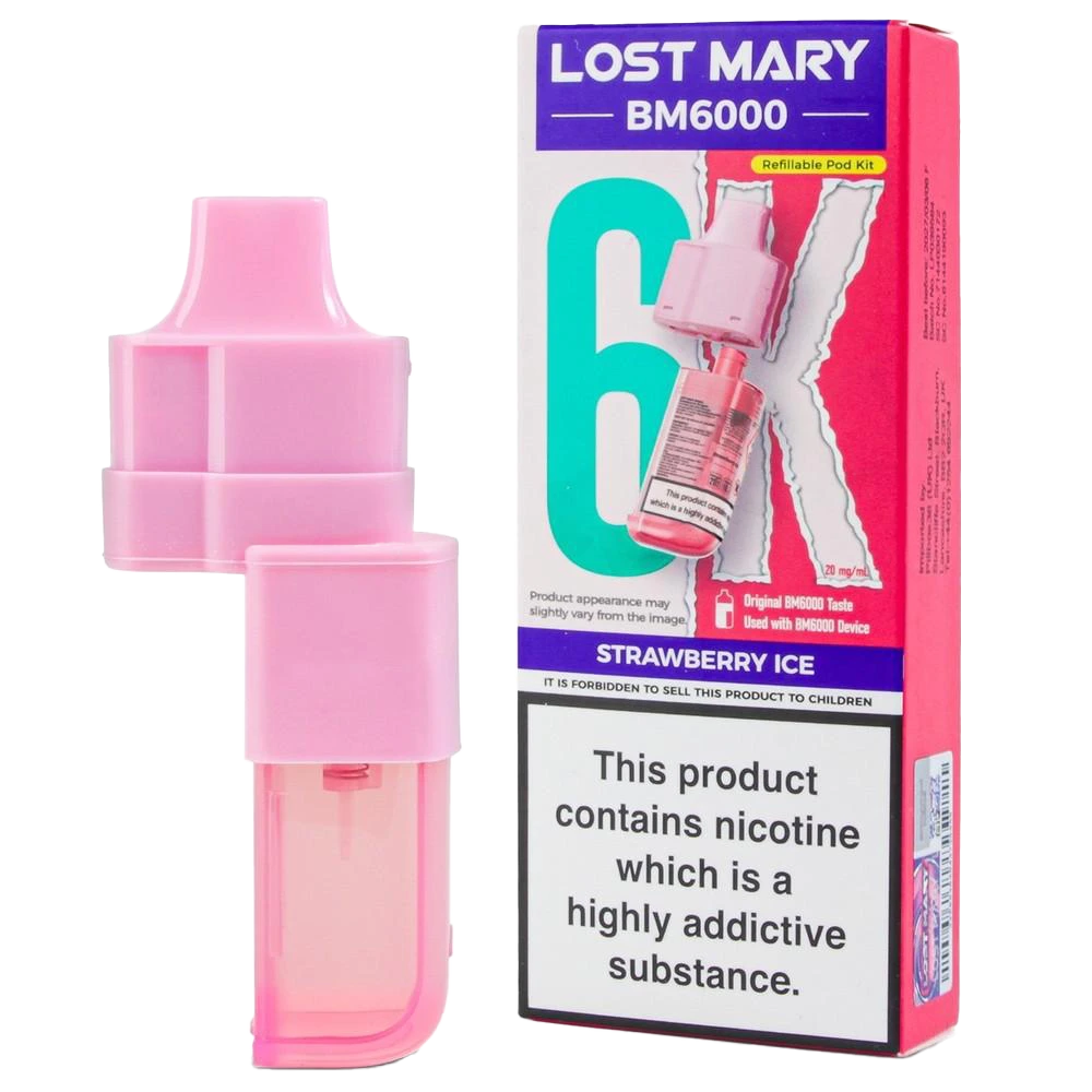 Lost Mary BM6000 prefilled pods combine a 2ml pod and 10ml refill for 6000 puffs, featuring 20mg nic salt and dual mesh coils for a natural strawberry ice MTL vape.