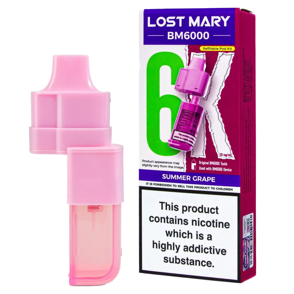 Lost Mary BM6000 prefilled pods combine a 2ml pod and 10ml refill for 6000 puffs, featuring 20mg nic salt and dual mesh coils for a juicy, sun-ripened summer grape MTL vape.