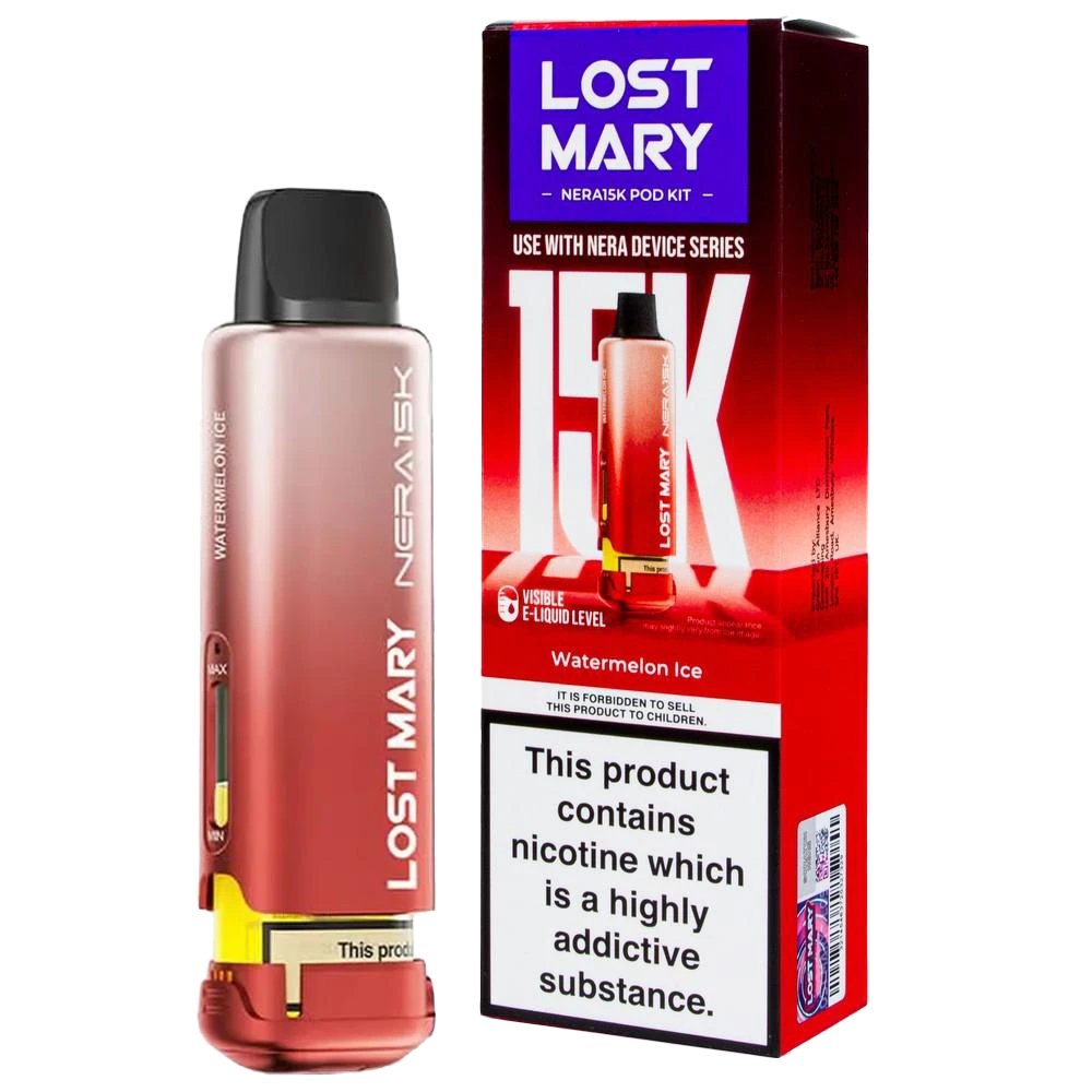 Watermelon Ice Lost Mary Nera refills provide a high-capacity, 15,000-puff experience by combining a 2ml mesh-coil pod with a 10ml auto-refill container, delivering an authentic watermelon and menthol nicotine salt flavor in a leak-resistant, magnetic system.
