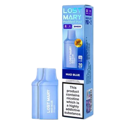 Mad Blue mixes blueberry, raspberry, and blackberry for a dark berry medley. These prefilled pods suit the Lost Mary BM600 Pod Kit and pack the disposable's complex berry flavour into swappable form. Blueberry leads with sweetness, raspberry adds tartness, and blackberry brings depth. The blend is more sophisticated than single-berry options. Compatible with BM600 devices only.