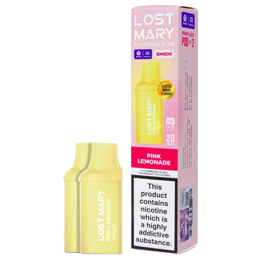Lost Mary BM600 replacement pods feature 2ml of 20mg nic salt e-liquid and a QUAQ mesh coil, delivering a refreshing sweet-tart pink lemonade blend for MTL vaping.